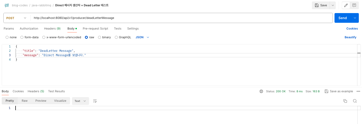 - MessageProperties의 setExpiration 메서드의 값을 지정하여서 메시지의 TTL의 시간을 지정합니다. - 해당 예시에서는 1000(1초)으로 지정하였습니다.