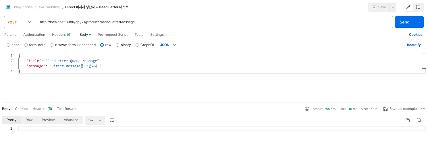 - Direct Exchange와 deadLetterQueue 간의 바인딩을 수행합니다. - Direct Exchange 방식으로 deadLetterQueue와 라우팅 키(Routing key)를 기반으로 바인딩 수행.
