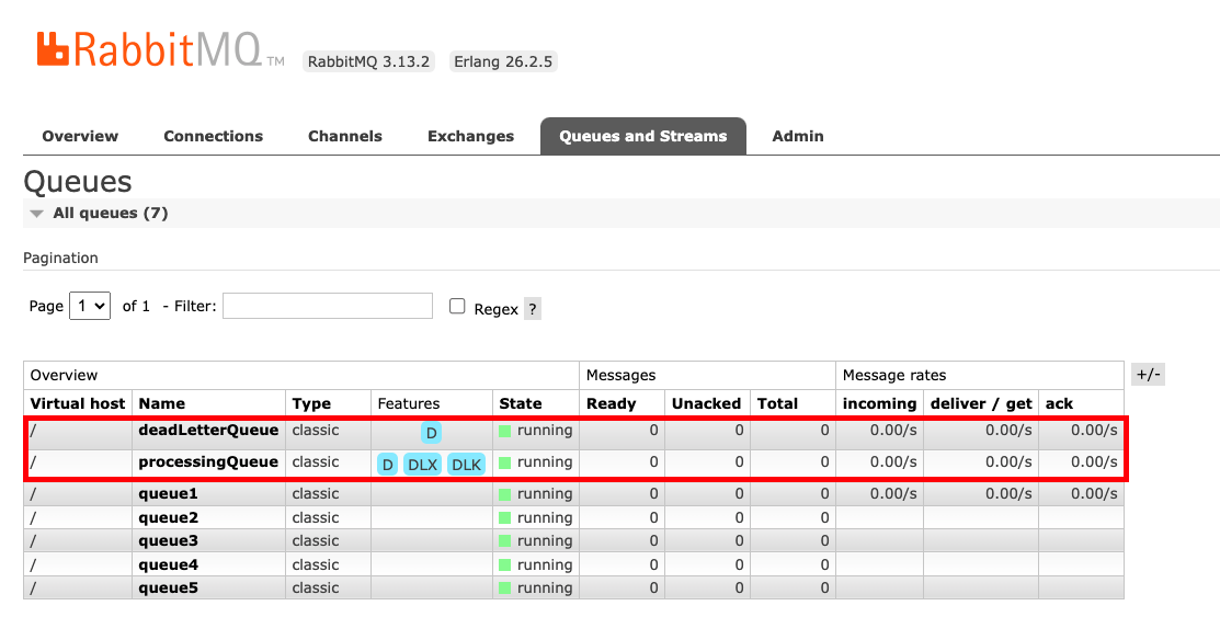 - Queue 구성 : processingQueue 이름의 큐를 구성 - 해당 큐에서는 속성 값으로 x-dead-letter-exchange가 발생 시 deadLetterExchange로 라우팅 됩니다 - 해당 큐에서는 속성 값으로 x-dead-letter-routing-key를 통해 Direct Queue의 라우팅 키를 전달하여 라우팅 됩니다.
