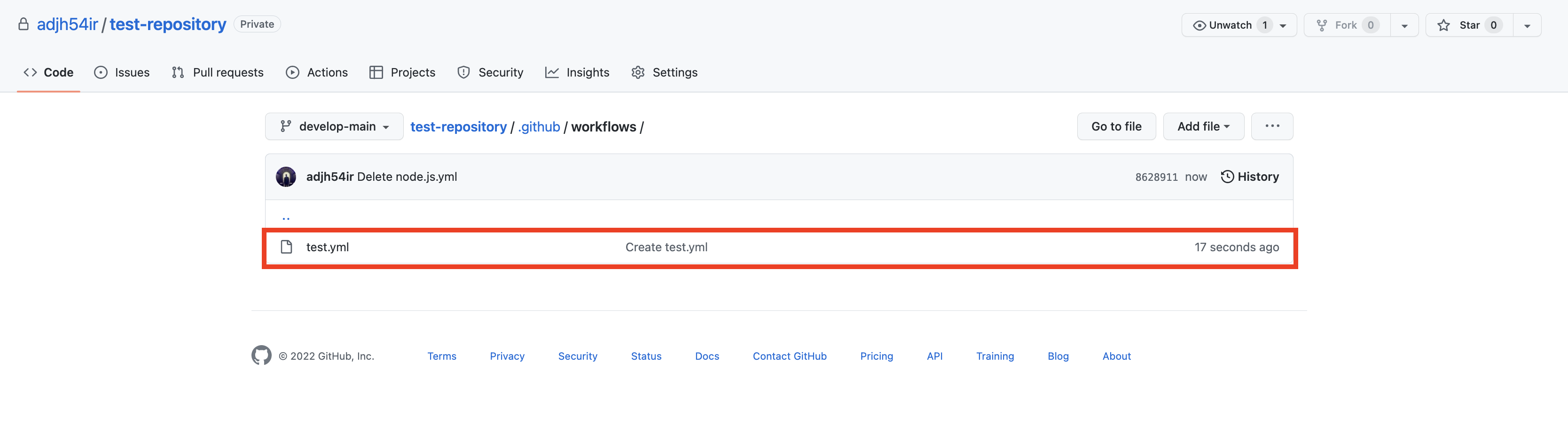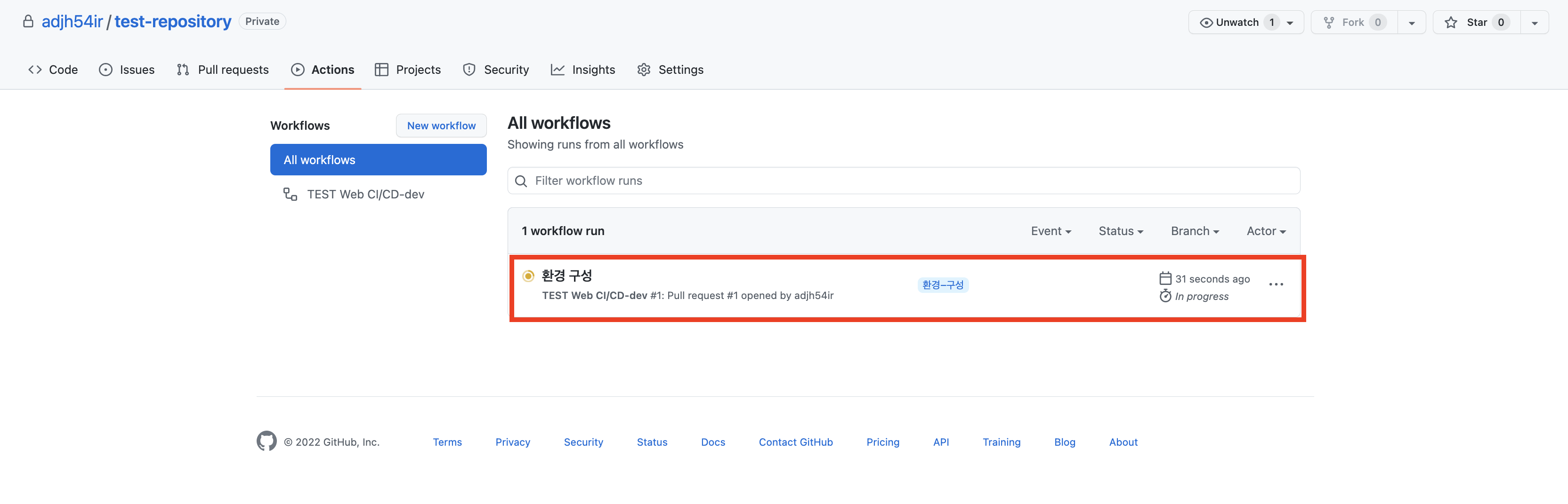 6. 'Actions' 탭으로 이동하면 해당 workflow가 수행됨을 확인 할 수 있습니다.