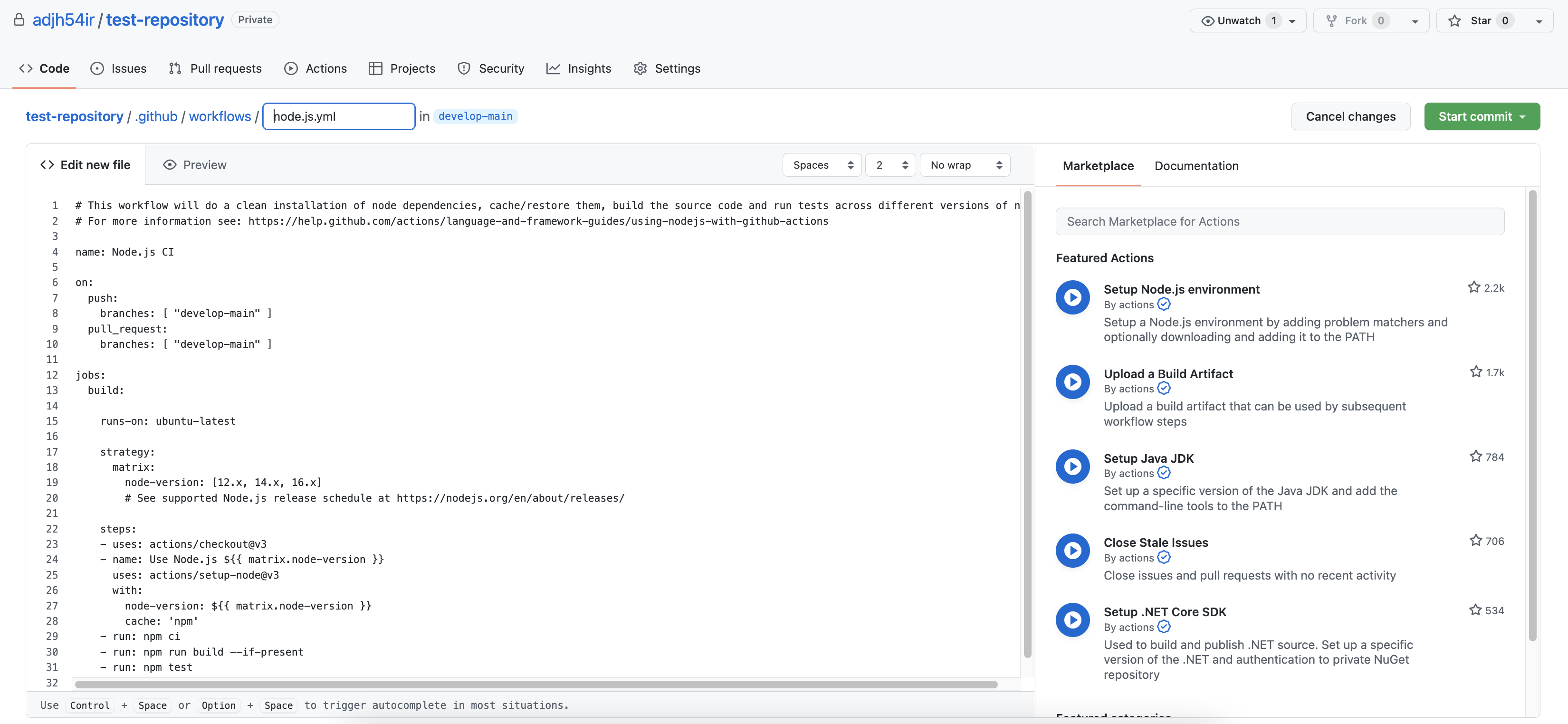 2. Actions 탭에서 Node.js 기반의 Github Actions를 구성합니다. 'Configure' 버튼을 누릅니다.