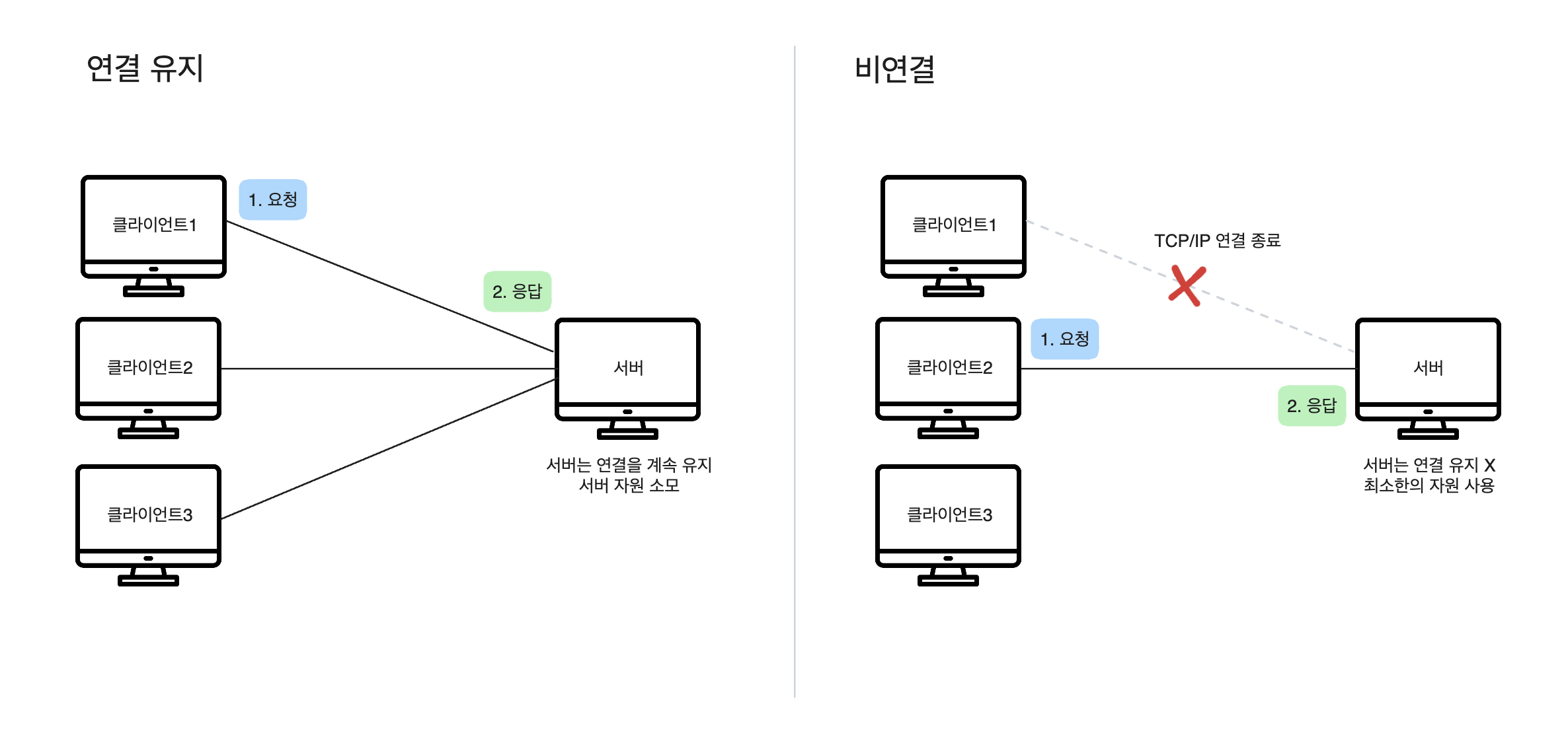 - HTTP는 상태를 유지하지 않는 비연결성 프로토콜이므로 한 번의 요청-응답을 통해 연결이 종료되면, 서버는 클라이언트와의 연결 상태를 기억하지 않습니다. - 이로 인해 서버의 부하가 줄어들지만, 이전의 요청과 그다음 요청 사이의 연결이 없어서 매 요청마다 새로운 연결이 필요합니다.