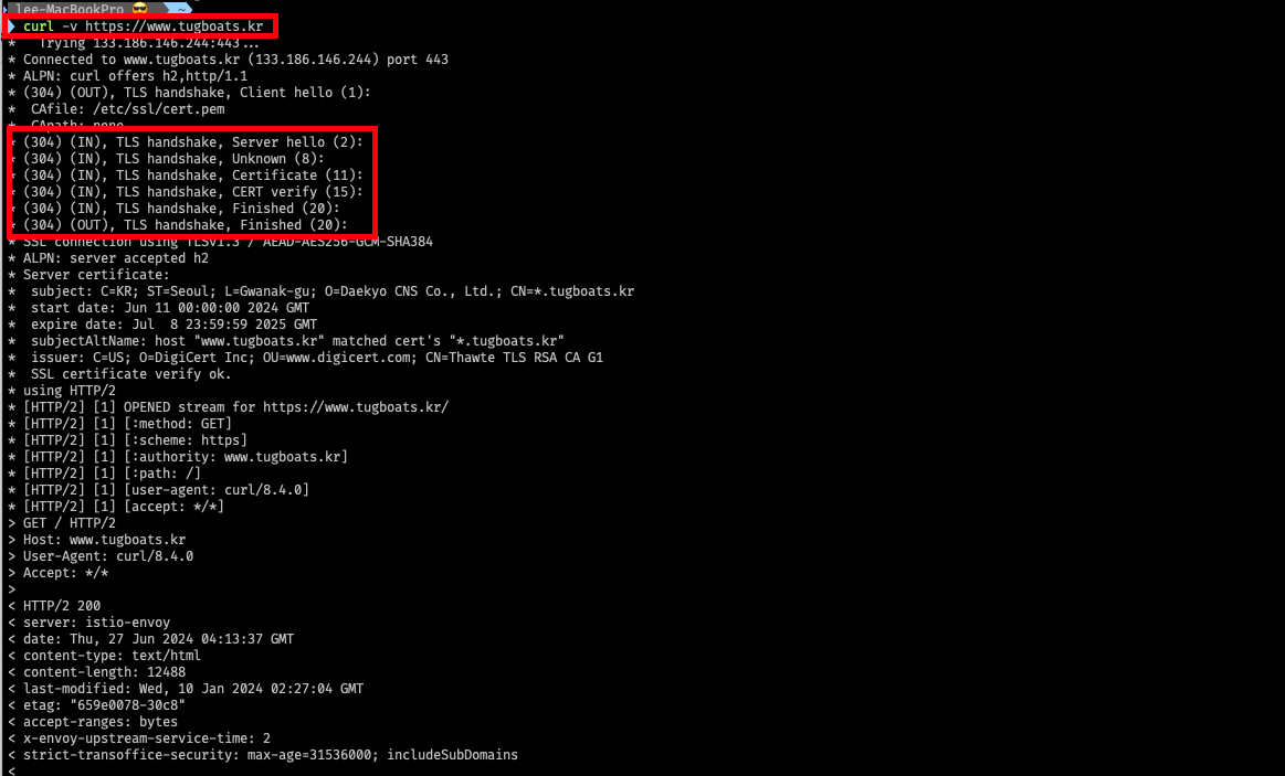 💡 [참고] curl -v HTTPS 사이트 명령어를 통해서 실제 SSL 핸드셰이크 과정을 확인하실 수 있습니다.