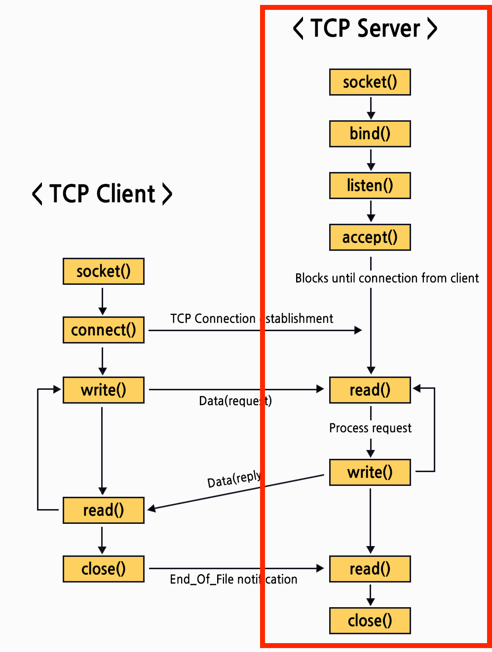 5. 데이터 수신 : read() - 서버가 클라이언트로부터 전송된 데이터를 읽습니다. 이 과정에서 서버는 클라이언트가 보낸 데이터를 처리하고 적절한 응답을 준비합니다.