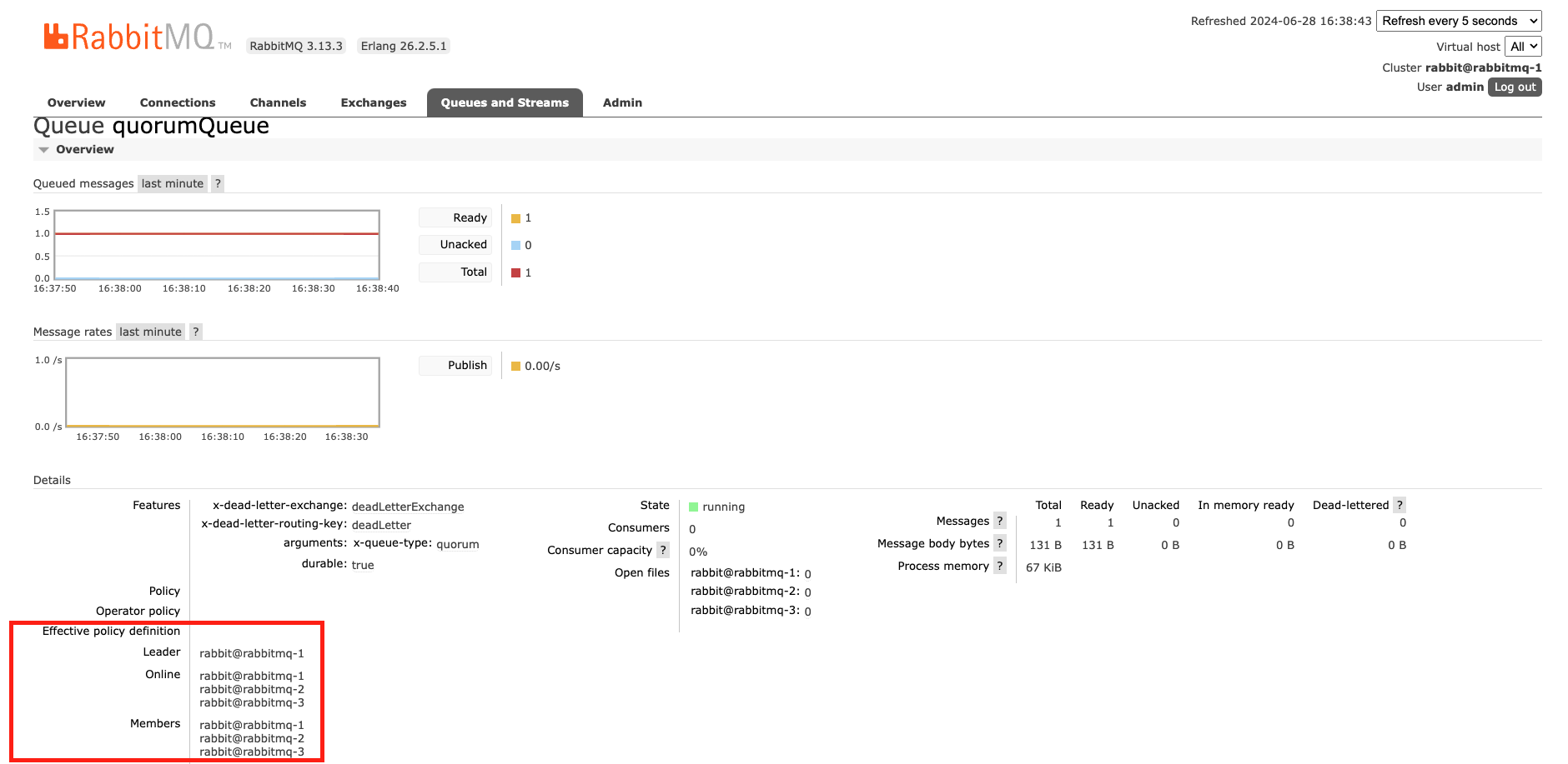 - http://localhost:15672/ 로 접속하여 생성된 관리페이지를 확인하고, 지정한 admin / 1234 값을 통해서 접근합니다.