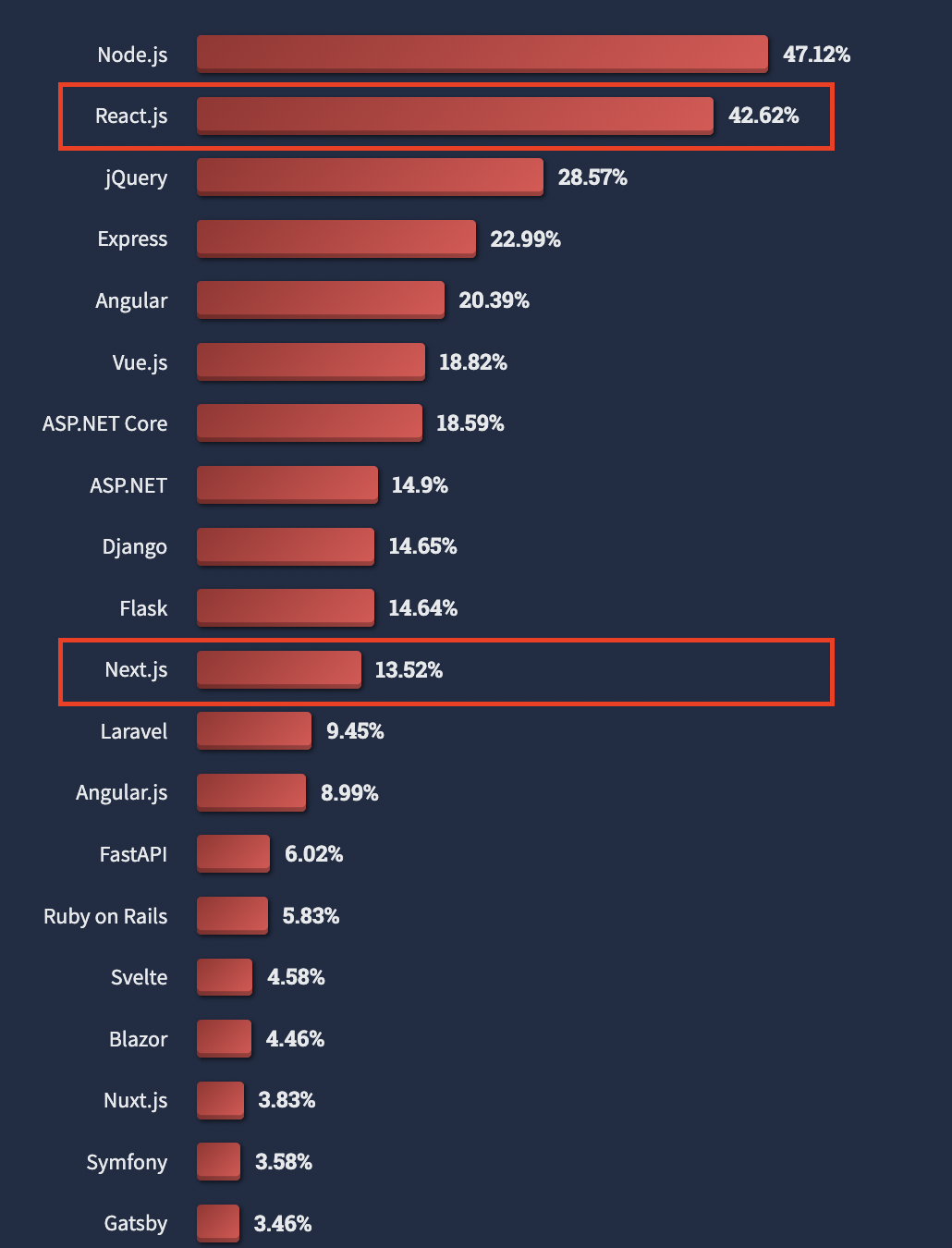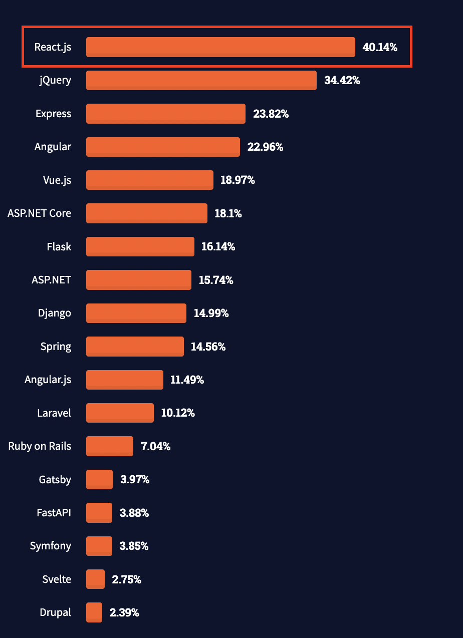 💡 2021년 / 2022년 Stack Overflow에서 조사한 웹 프레임워크 선호도 조사입니다. - 2021년에 React.js는 압도적인 1위를 차지하였습니다. - 2022년에는 React.js는 1위에서 2위로 넘어가고 주목할 점은 Next.js가 2022년에는 포함이 되었습니다.