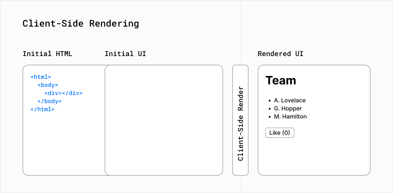- 서버에서 전체 페이지(빈 페이지)를 최초 렌더링하고 사용자가 요청 할 때마다 클라이언트 내(브라우저)에서 렌더링 하는 것을 의미한다. (💡 렌더링: HTML,CSS, 자바스크립트 등 개발자가 작성한 문서가 브라우저에서 출력되는 과정을 말합니다.)
