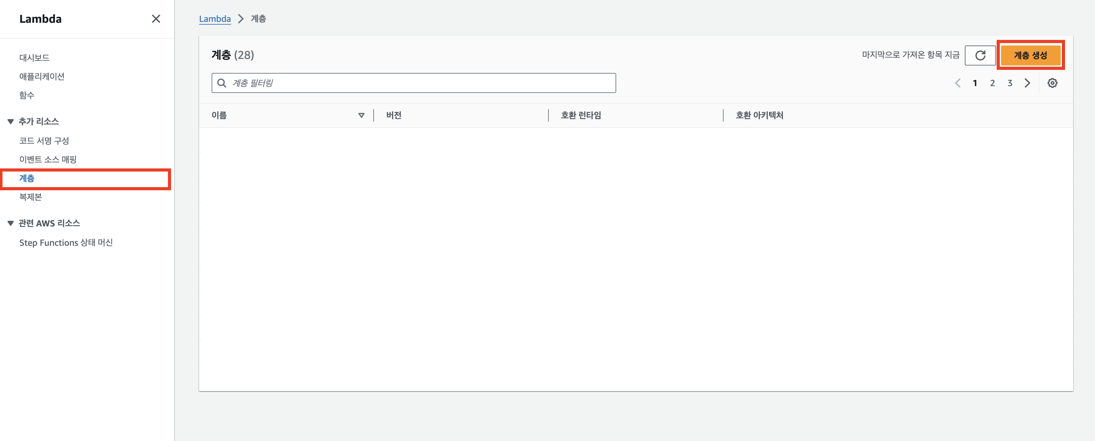 2. [Lambda → 계층] 계층 생성 버튼을 눌러서 계층 생성 페이지로 이동합니다.