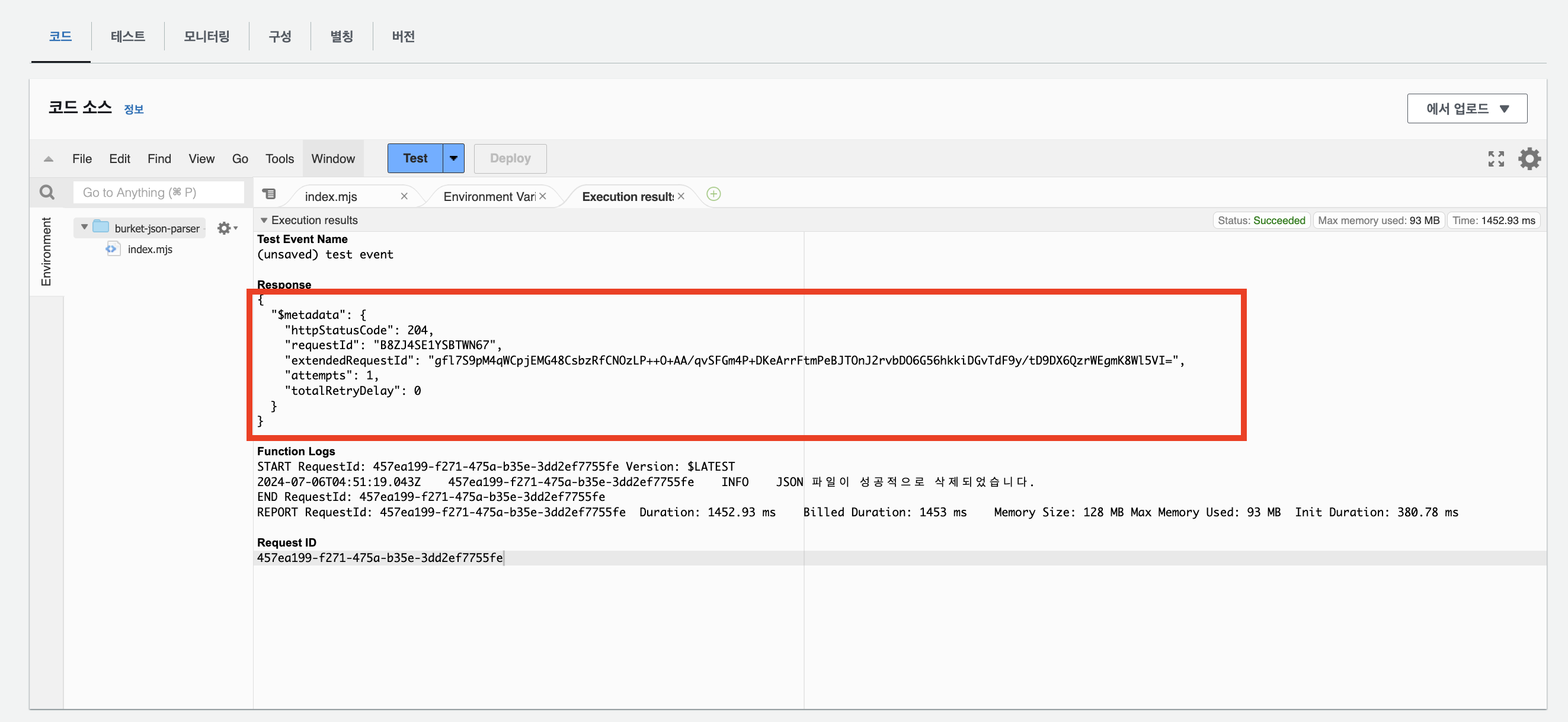- S3 Bucket 내에 접근하여 json 파일이 성공적으로 삭제됨을 확인하였습니다.