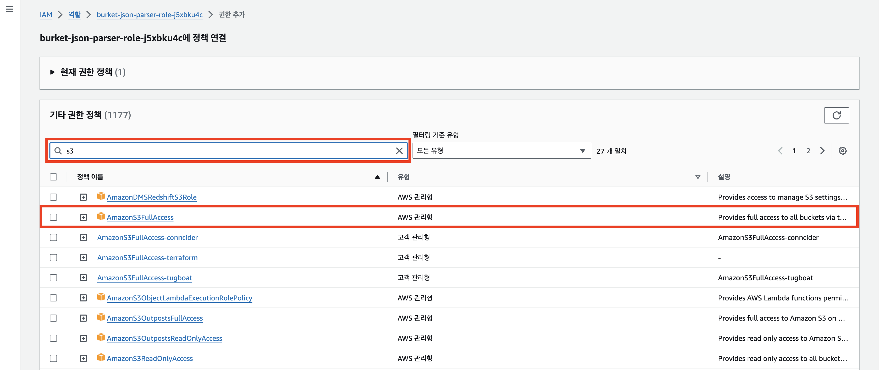 3. [IAM → 역할 → Lambda 함수 → 권한 추가] 테스트를 위해 s3 관련 모든 권한을 부여합니다.