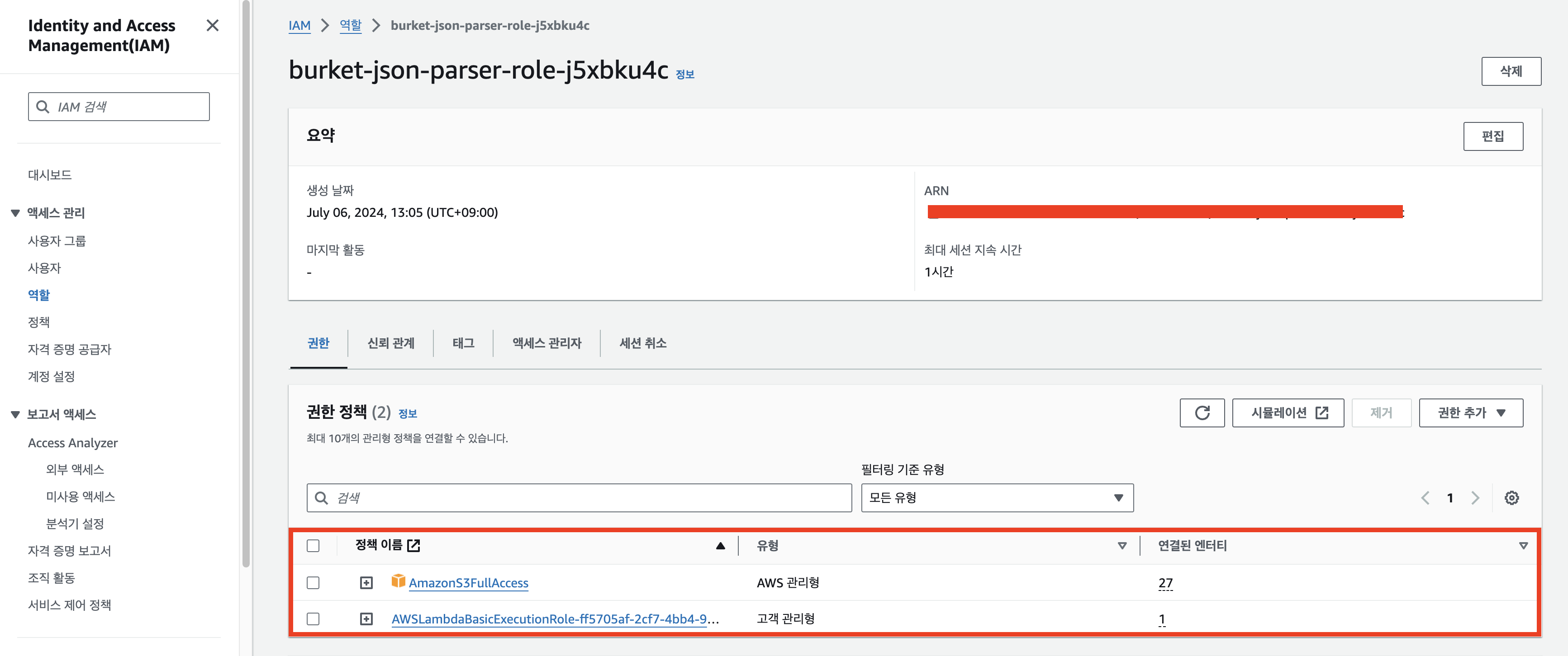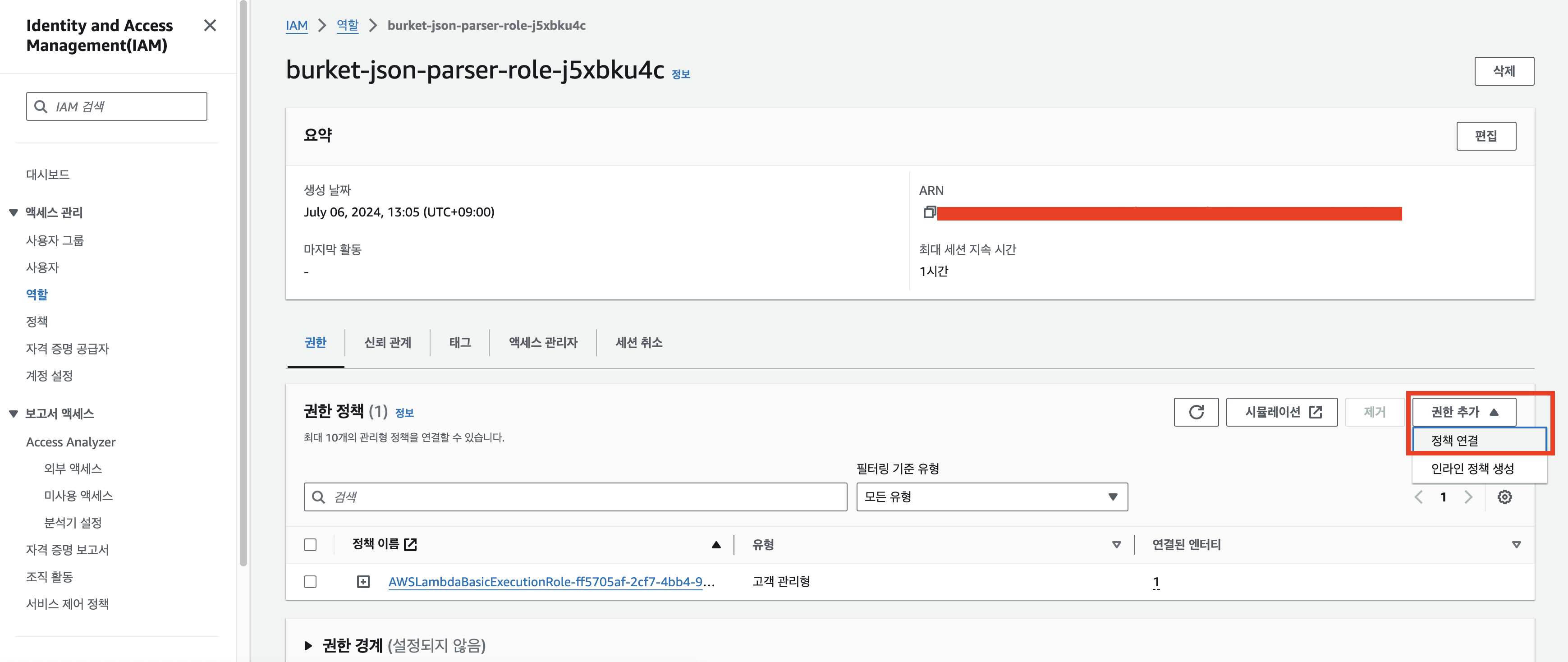 5) Lambda 서비스(S3 Bucket) 접근 권한 추가