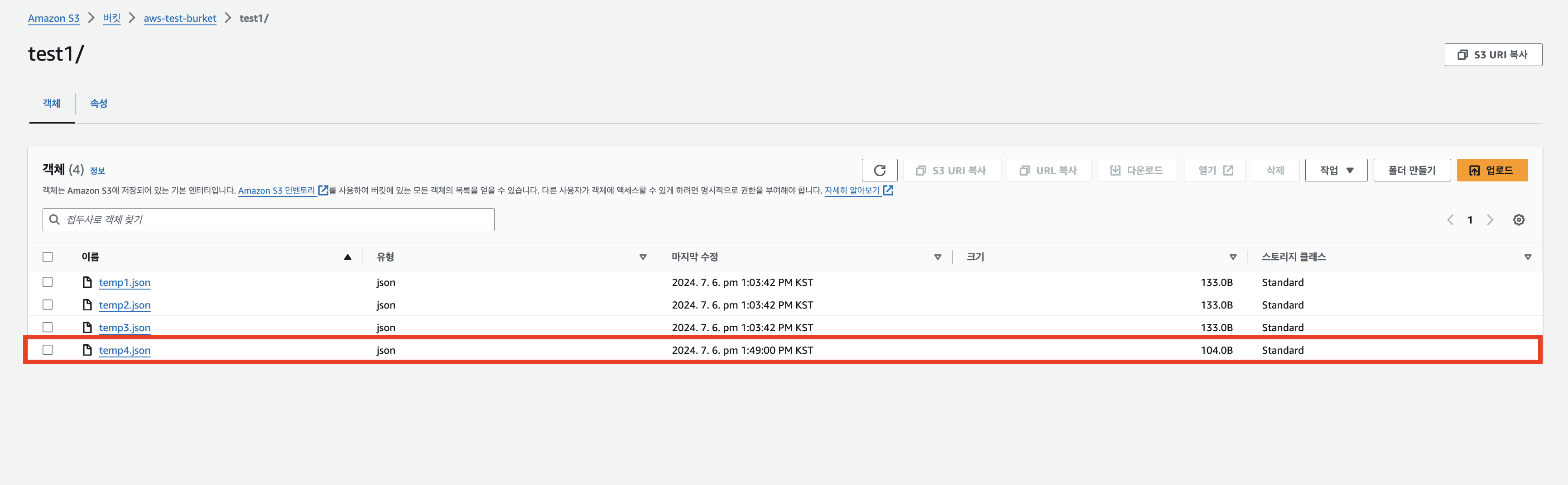 💡 S3 Bucket의 test1 폴더 내에 json 파일이 업로드가 됨을 확인하였습니다.