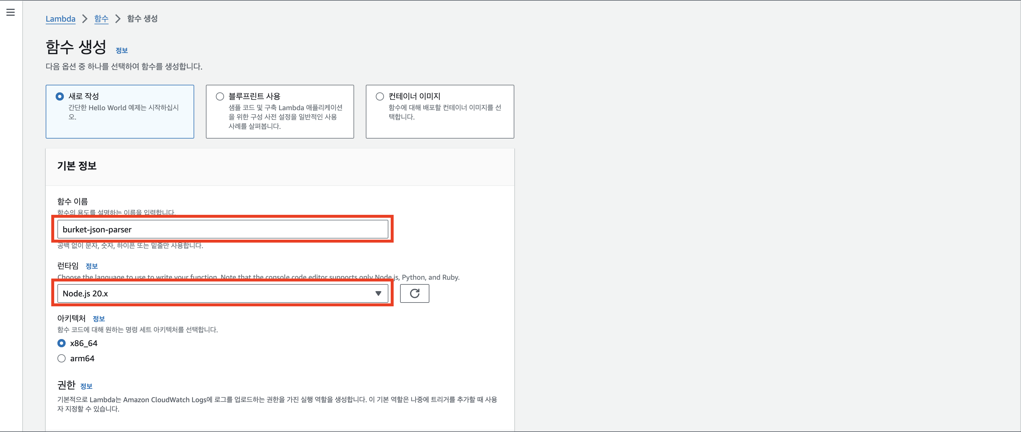 1. [Lambda → 함수] 함수 생성 버튼을 선택하고 함수 이름과 런타임을 지정하여 구성합니다.