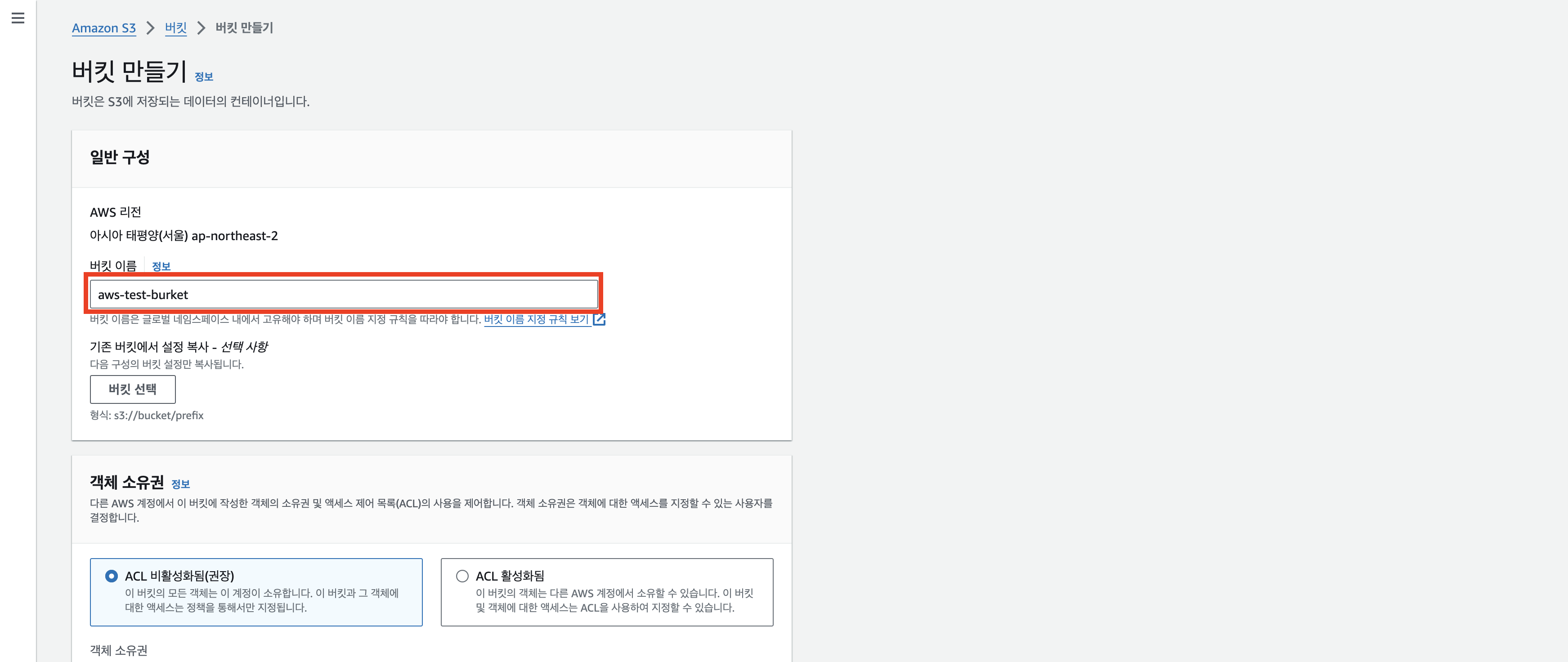 - 테스트를 진행하기 위해서 S3 Bucket을 임시로 생성합니다.
