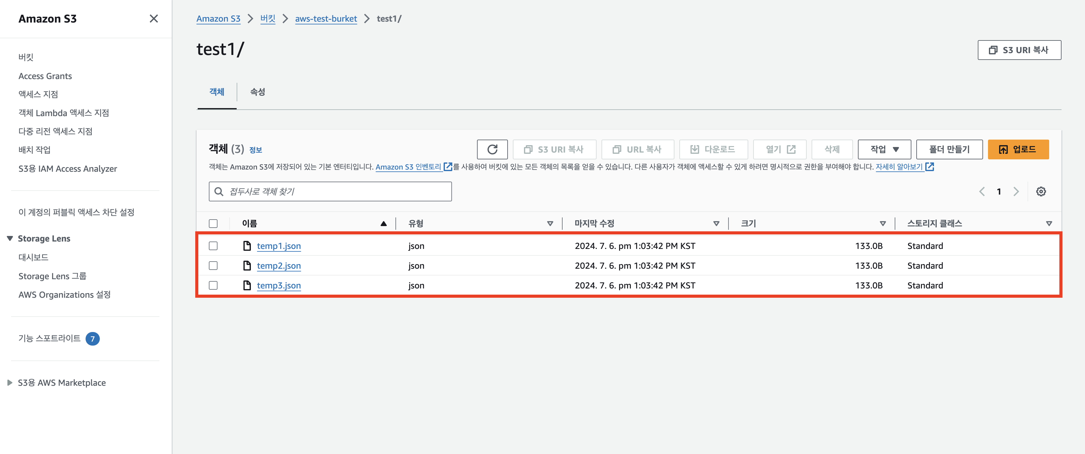 - S3 Burket 내에 접근하여 json 파일을 업로드가 수행됨을 확인하였습니다.