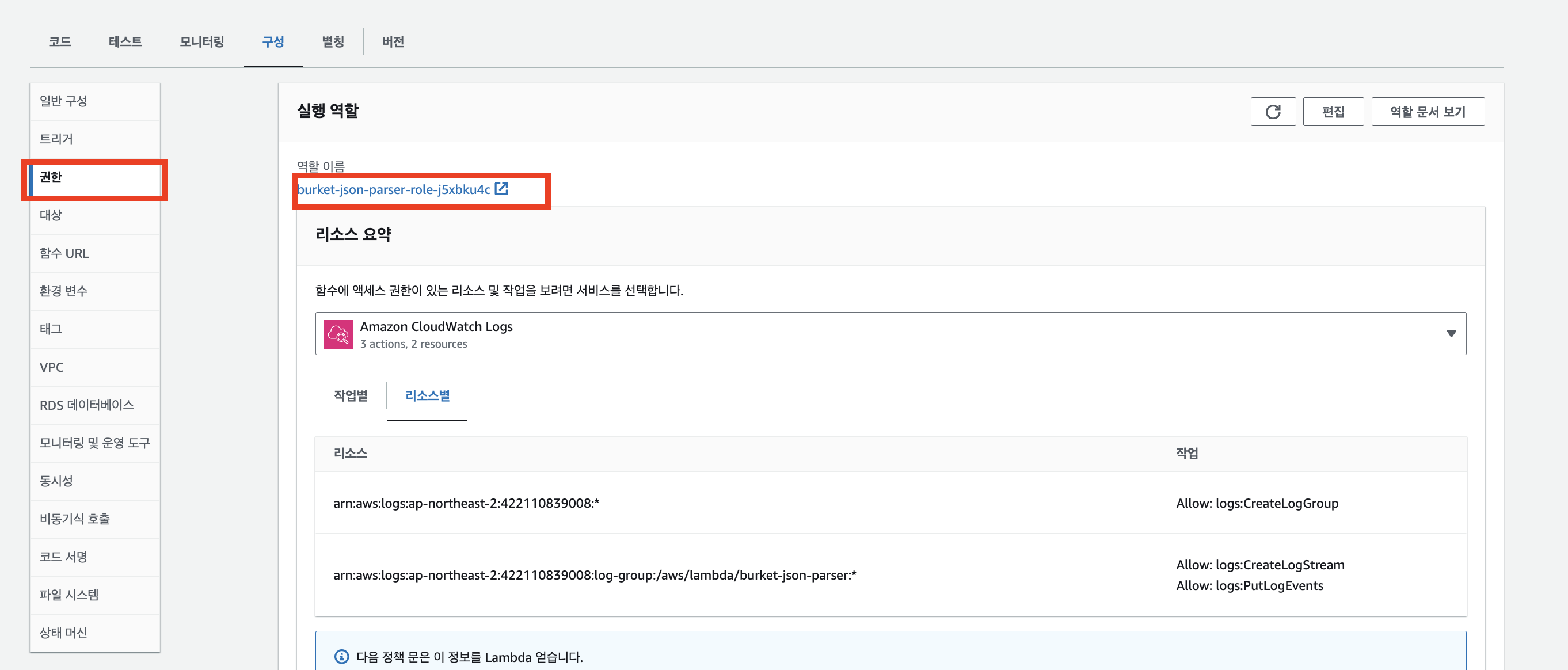 1. [Lambda 함수 → 구성 → 권한] Lambda 페이지 내에서 ‘역할 이름’을 선택합니다.