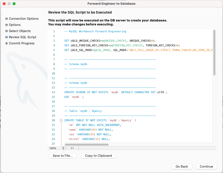 4. [Review SQL Script 단계] DDL이 생성되었습니다.