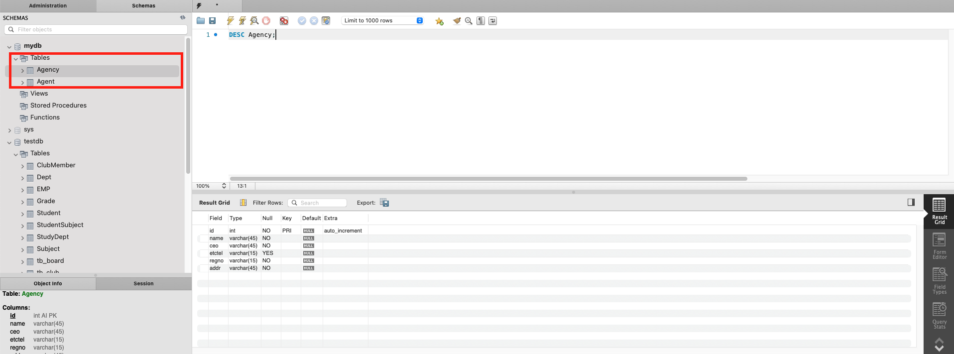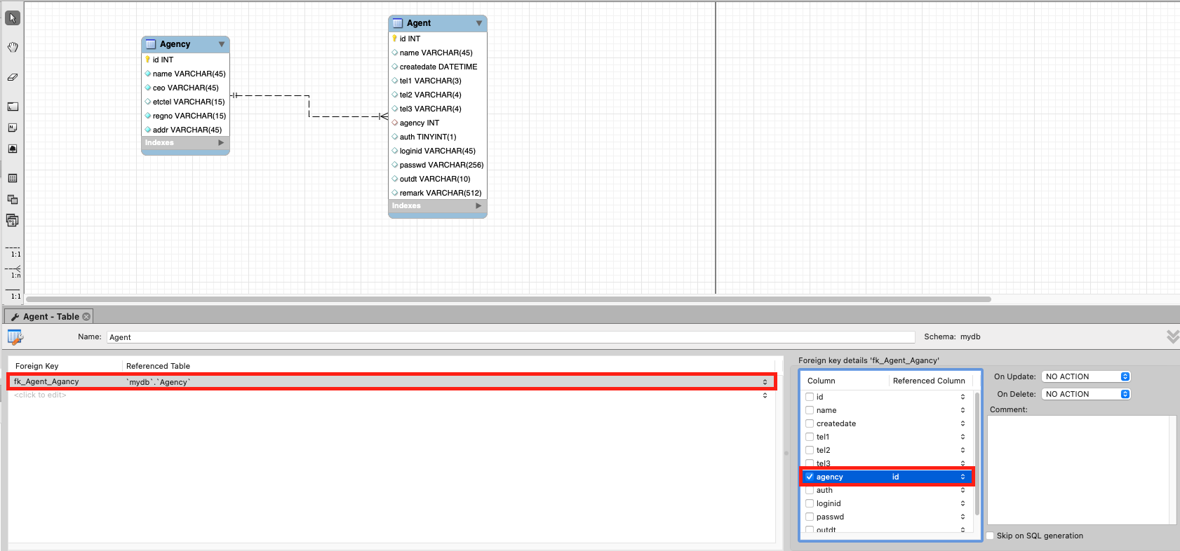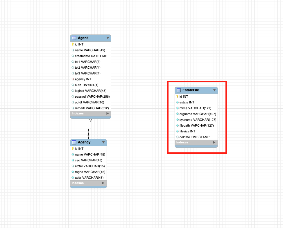 - 해당 예시에서는 부동산(Agency) 테이블과 중개인(Agent) 테이블 간의 1 : 다 관계를 맺습니다. - 부동산(Agency) 테이블의 id 컬럼 값이 중개인(Agent) 테이블의 agency 컬럼과 연결됩니다.