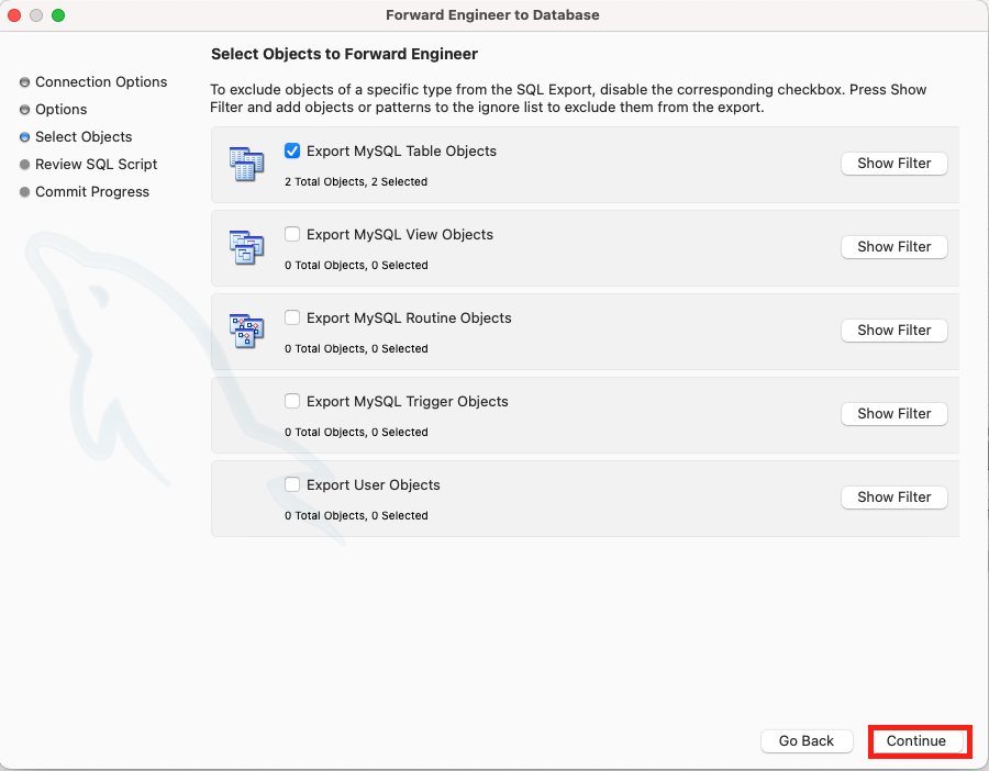 - 특정 Table, View, Routine, Trigger 등 객체를 비활성화하려면 체크박스를 해제하면 됩니다.