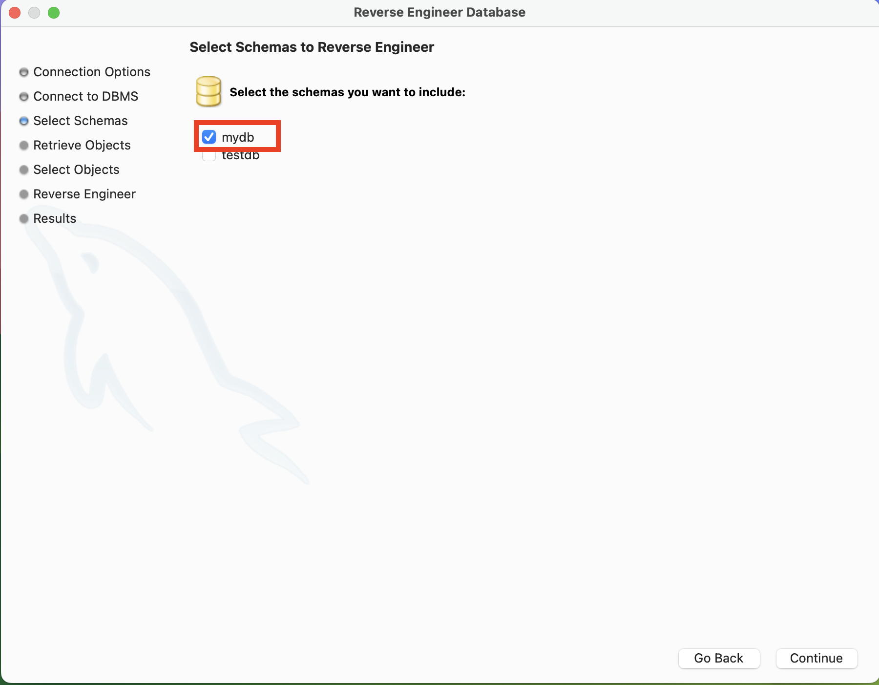 5. [Select Schemas 단계] 이전에 모델링을 수행했던 스키마를 선택합니다.