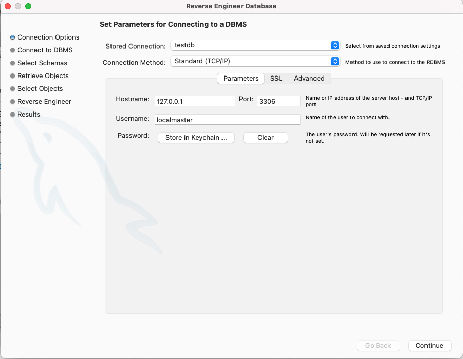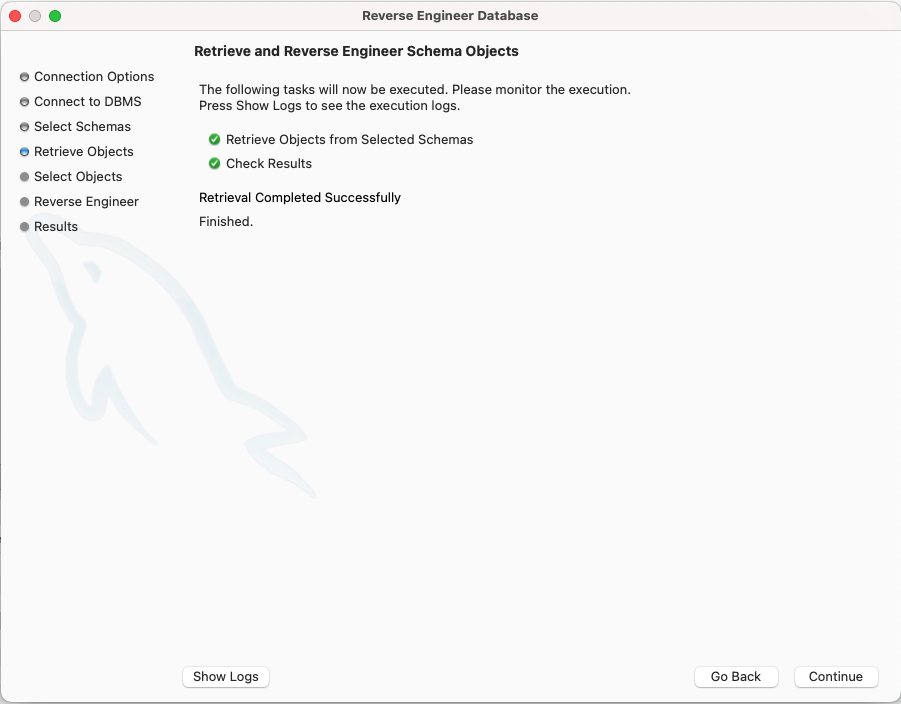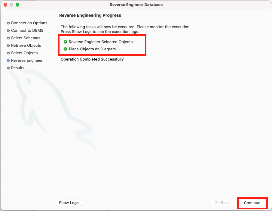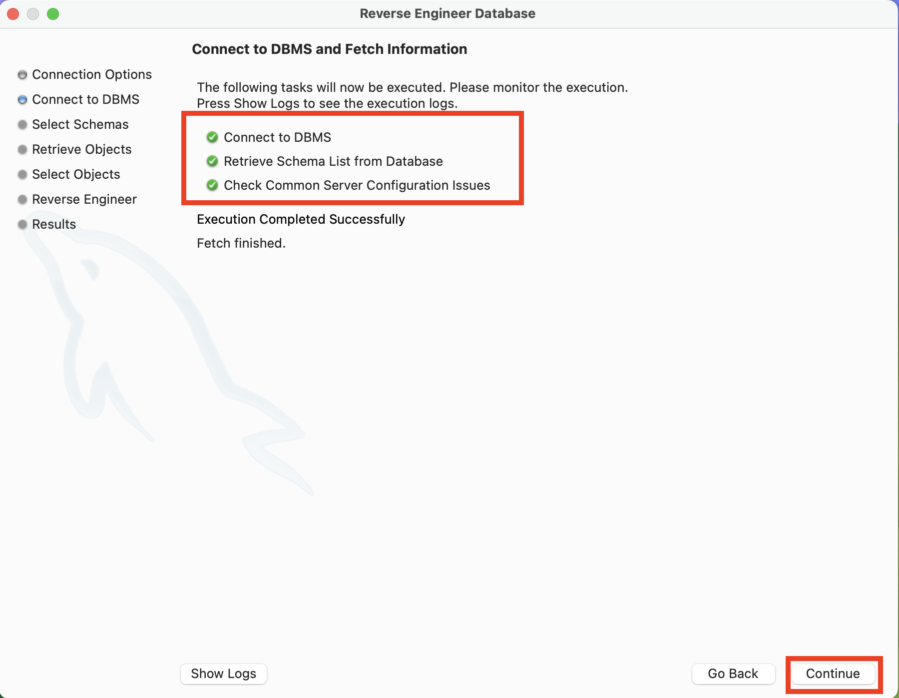 4. [Connect to DBMS 단계] 데이터베이스 연결이 됨을 확인되었고 ‘Continue’ 버튼을 선택합니다.