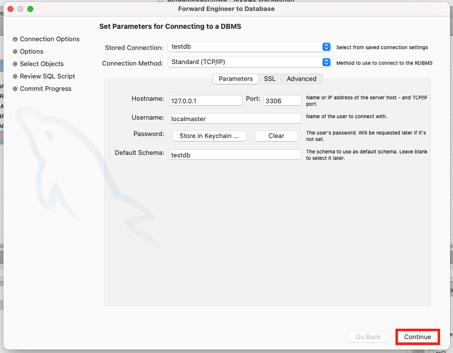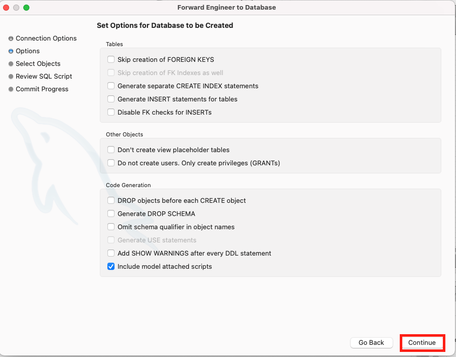 2. [Connection Options 단계] 생성하려는 스키마를 확인하고 ‘Continue’ 버튼을 누릅니다.