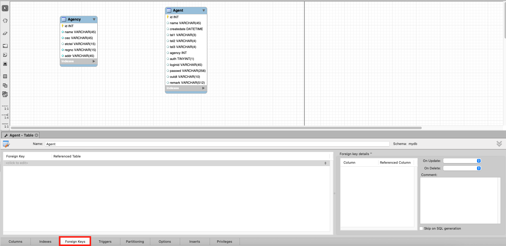 1. 생성한 테이블을 선택하고 하단의 탭 ‘Foreign Keys’를 선택합니다.