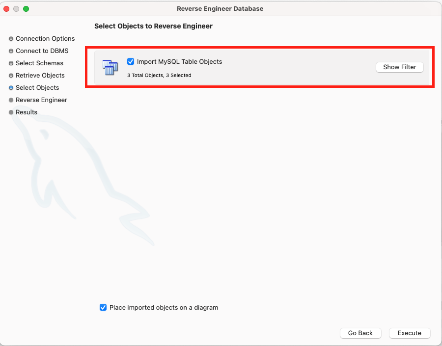 7. [Select Objects 단계] Forward Engineer로 추가된 테이블 및 SQL DDL로 추가한 테이블을 포함하여 총 3개에 대해 수행을 위해 ‘Execute’ 버튼을 누릅니다