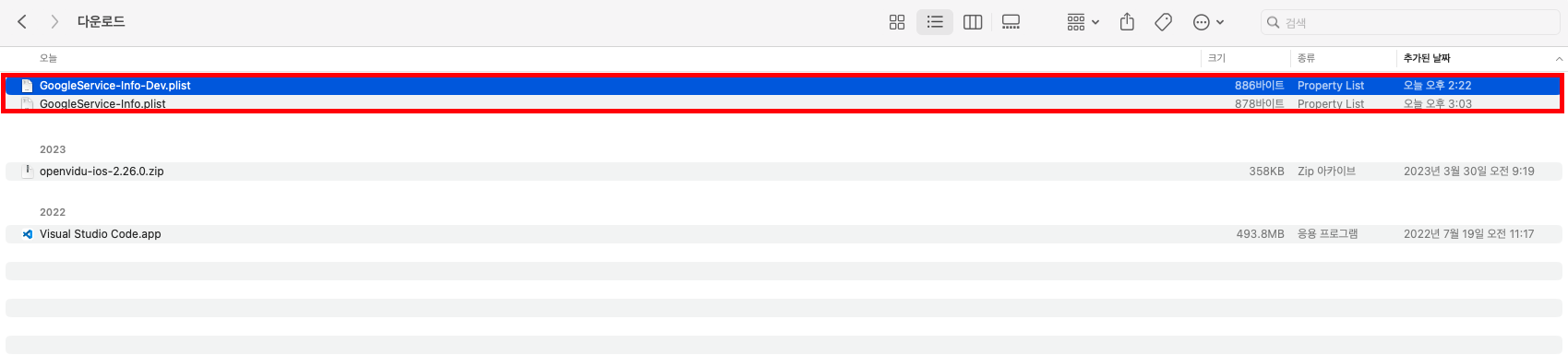 - 이름이 중복되므로 개발(dev)인 경우는 GoogleService-Info-Dev.plist 파일로 설정하고 운영(prd)인 경우는 기존의 이름인 GoogleService-Info.plist로 지정합니다.