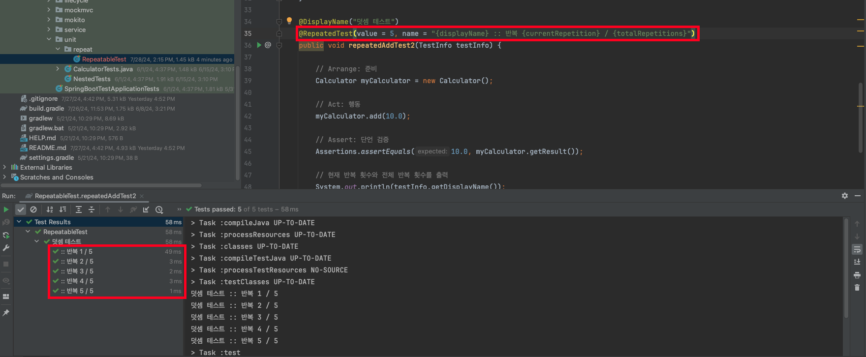 @RepeatedTest(value = 5, name = "{displayName} :: 반복 {currentRepetition} / {totalRepetitions}")