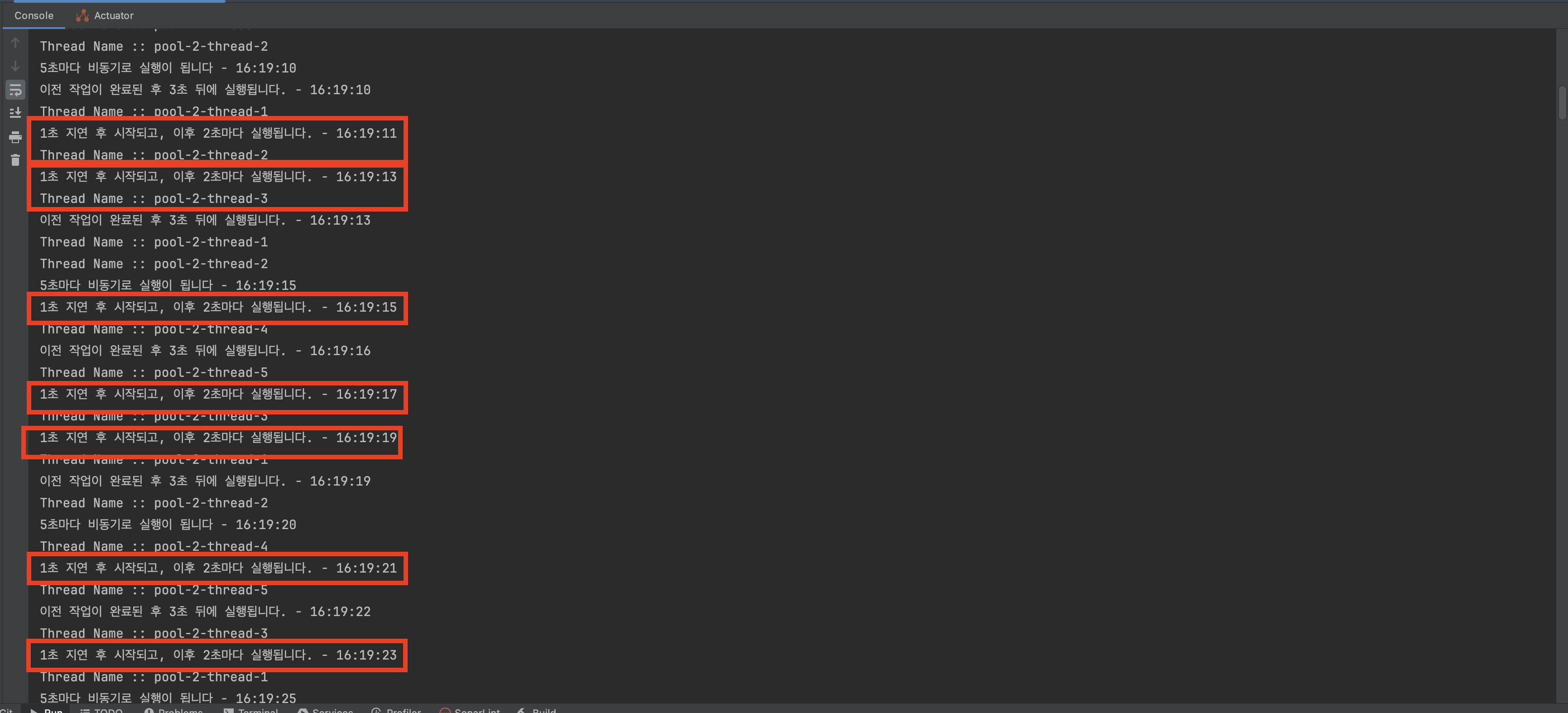 - 1초 지연 후 시작되고, 이후 2초마다 실행됩니다. - 해당 메서드 내에서는 1초 지연 후 시작되고, 이후 2초마다 비동기적으로 처리되는 형태를 확인할 수 있습니다.