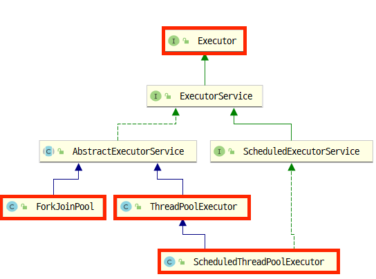 - Executor 인터페이스를 구현하기 위해서 여러 구현체로 사용이 됩니다. - SimpleAsyncTaskExecutor는 Executor를 구현하기 위한 구현체로 Spring Framework에 내장되어 있습니다. - ThreadPoolTaskExecutor, ScheduledThreadPoolExecutor, ForkJoinPool는 Executor를 구현하기 위한 구현체로 java.util.concurrent 패키지 내에 포함이 되어 있습니다.
