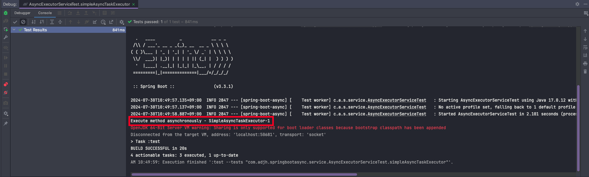 - AsyncConfig 내에서 지정한 simpleAsyncTaskExecutor를 이용하여서 비동기를 수행합니다.