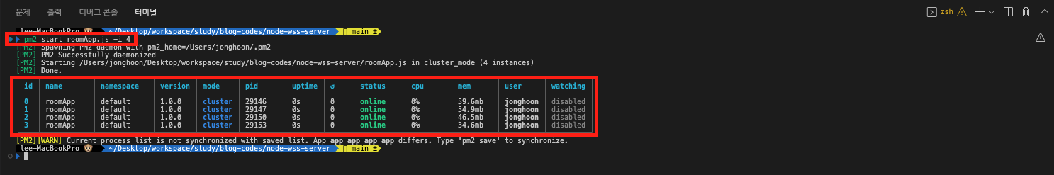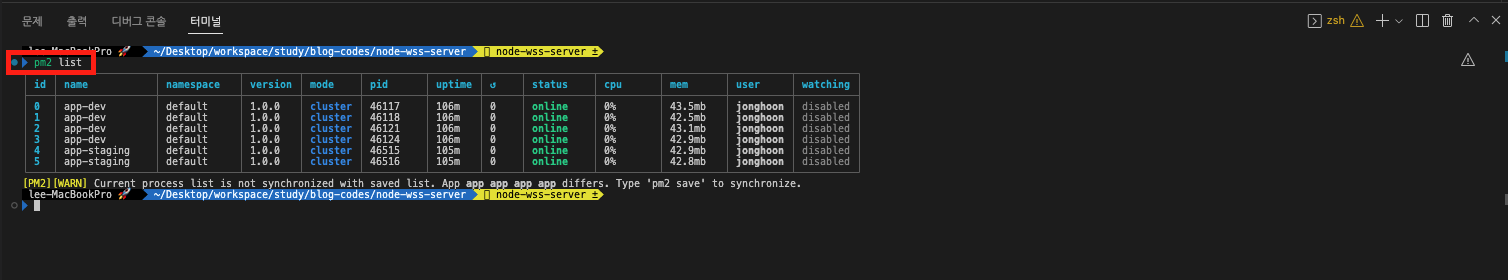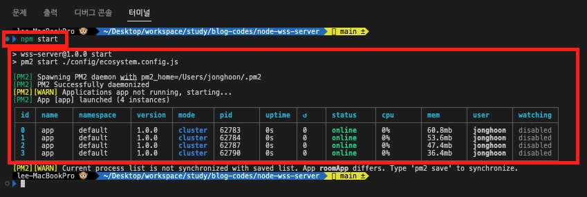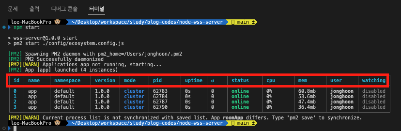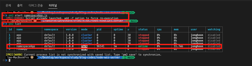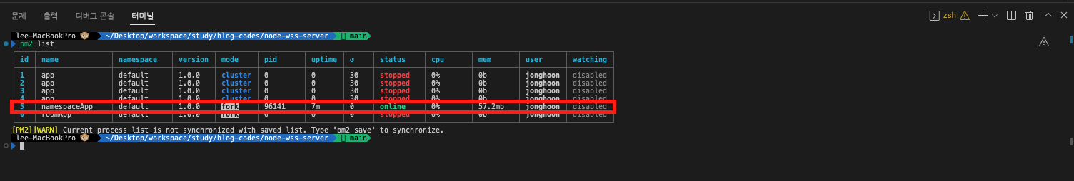 - 백그라운드에서 실행이 되는지 확인하기에 다시 한번 pm2 start로 해당 프로레스를 실행하면 이미 실행 중을 이야기하고 있습니다. - 또한 pm2 list 명령어를 입력하면 이전에 실행한 namespaceApp.js 프로세스가 실행됨을 확인하였습니다.