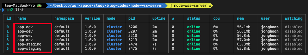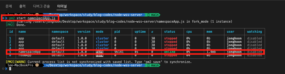 - 아래와 같이 pm2 start namespaceApp.js라는 파일을 pm2를 이용하여 PM2 CLI를 통해서 데몬 프로세스에 명령을 실행하였습니다. - 데몬은 namespaceApp.js라는 프로세스를 생성하고, 백그라운드에서 실행이 됩니다