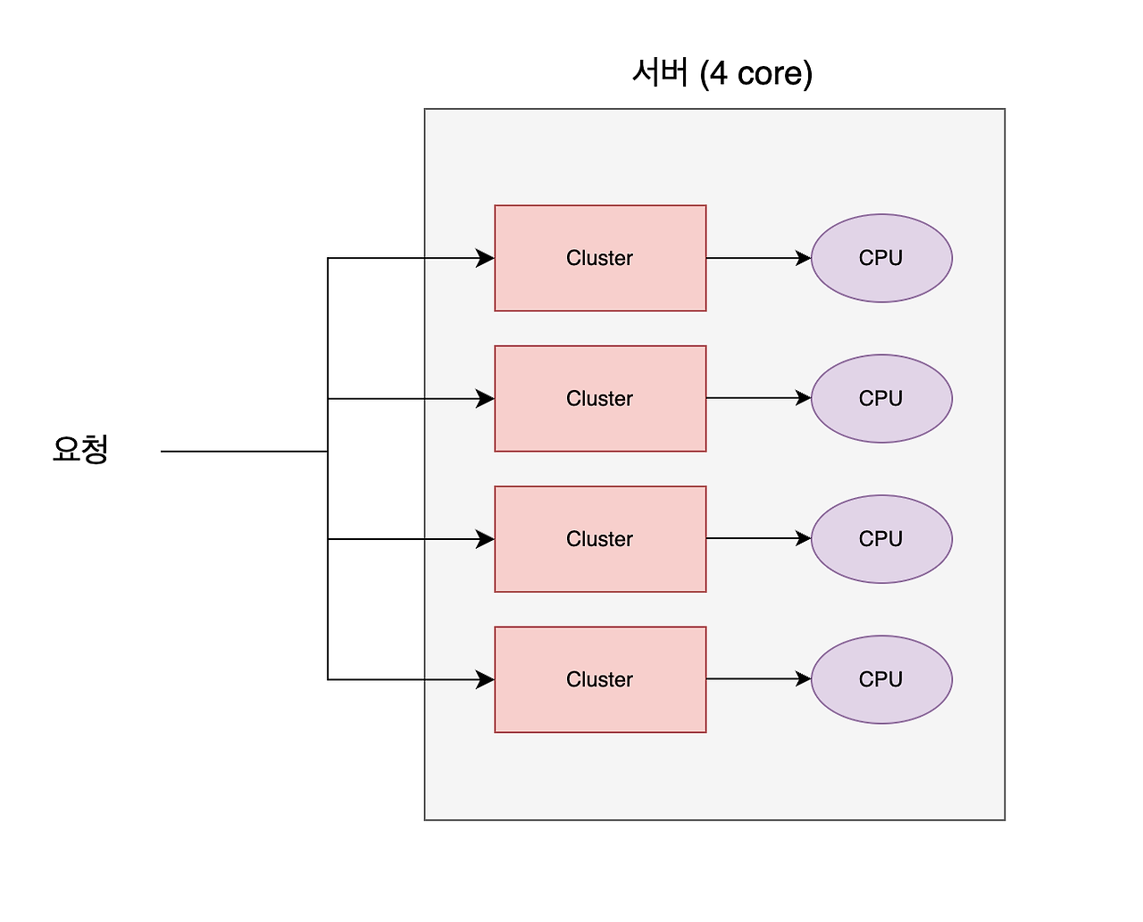- Node.js의 클러스터 모듈을 활용하여 여러 프로세스를 생성합니다. 이를 통해 멀티 코어 시스템에서 애플리케이션의 성능을 최적화할 수 있습니다. - 단일 스레드인 Node.js에서 클러스터 모드를 사용하여 멀티 스레드와 유사한 성능을 낼 수 있게 해 줍니다.
