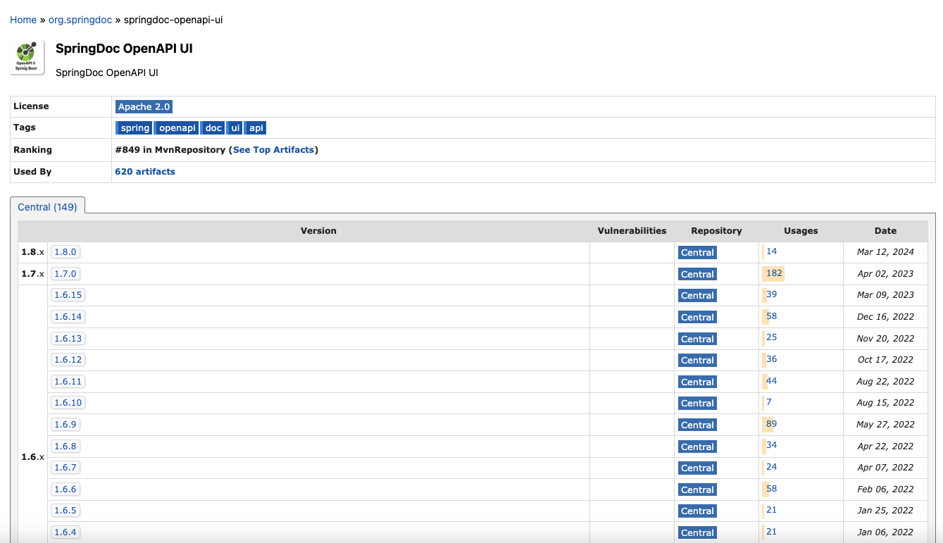 - springdoc-openapi v1.8.0의 경우 Boot 2.x 및 1.x를 지원하는 최신 오픈 소스 릴리스입니다. 2023년 이후에도 지원이 필요한 조직을 위해 springdoc-openapi v1 프로젝트에 대한 확장 지원이 이제 제공됩니다. 자세한 내용은 sales@springdoc.org로 문의하세요.