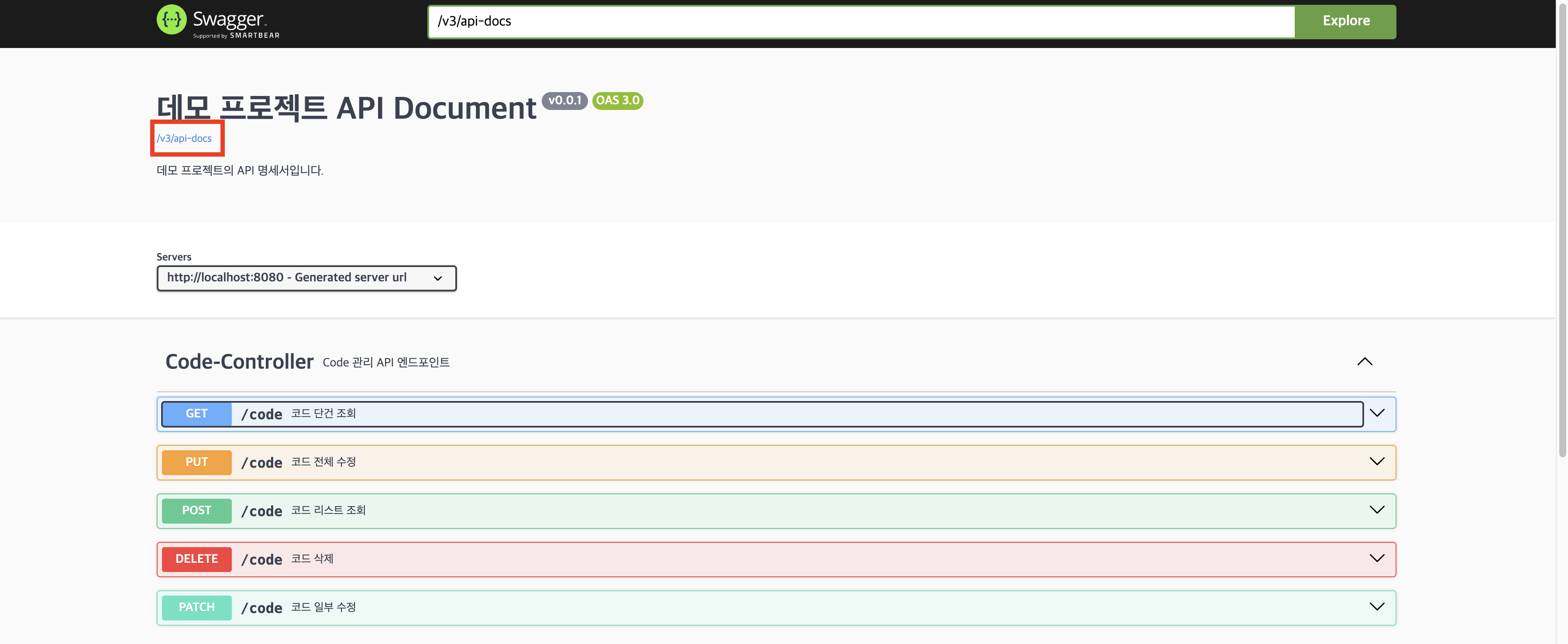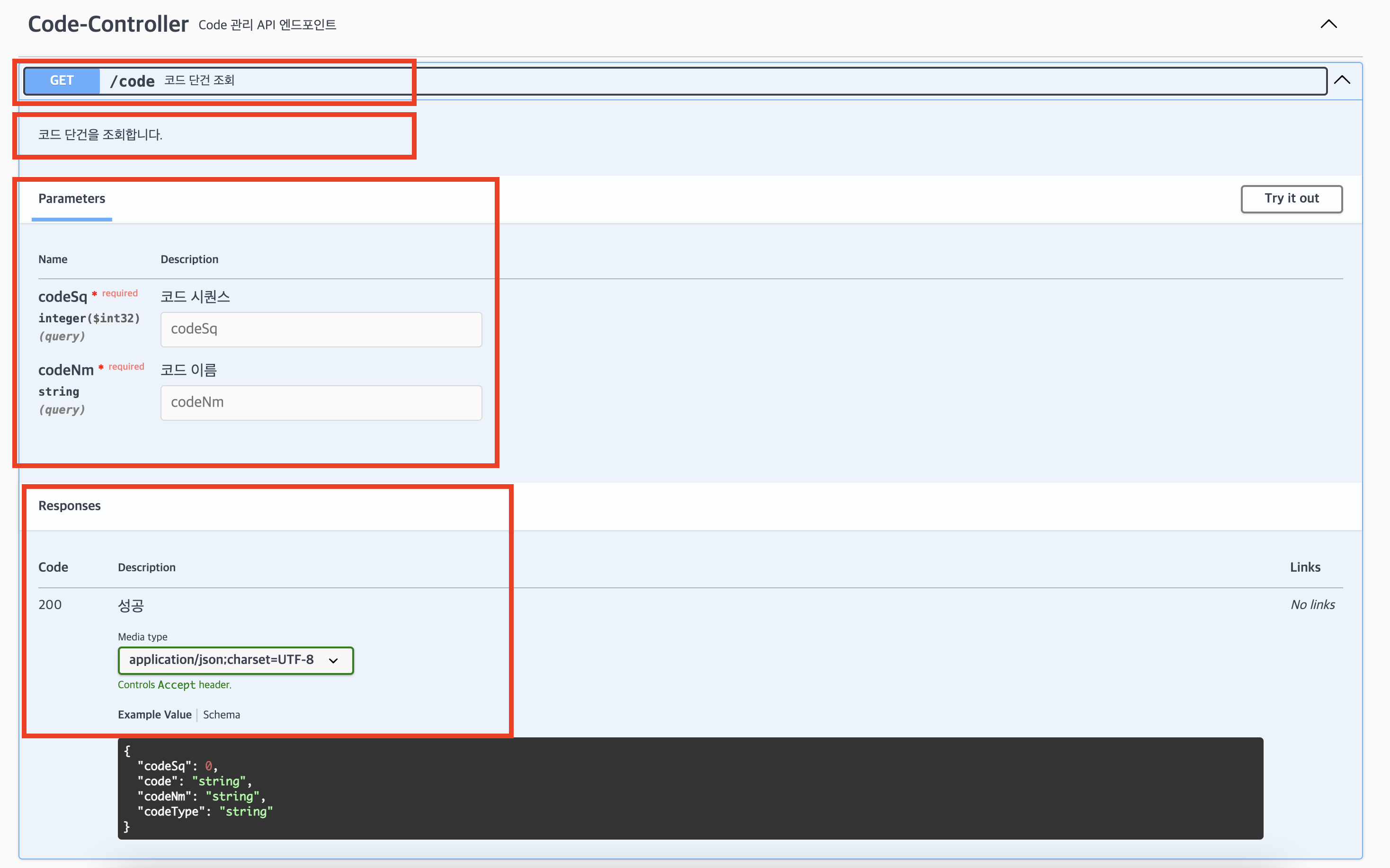 @Operation(summary = "코드 단건 조회", description = "코드 단건을 조회합니다.")