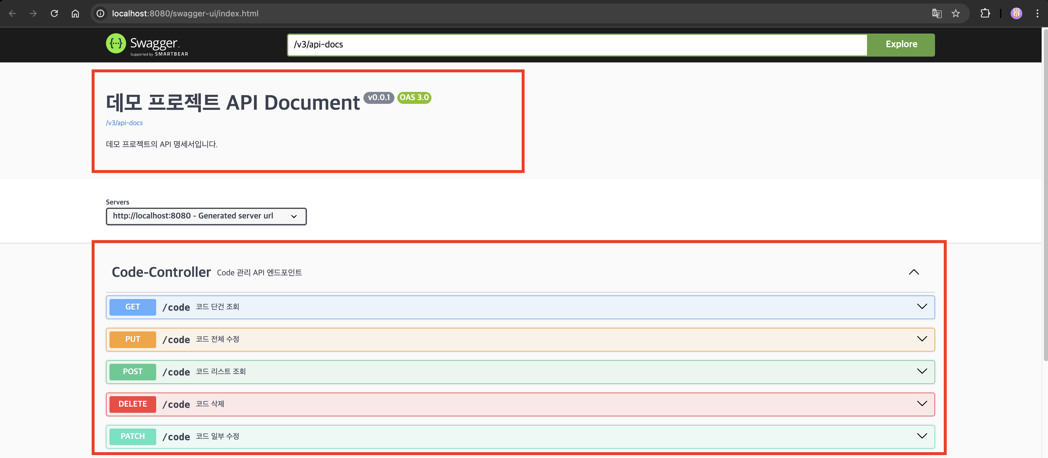 - Swagger로 구성하는 API 문서의 제목, 버전, 설명에 대해서 설정합니다. - 즉, "데모 프로젝트 API Document"라는 제목, "v0.0.1" 버전, 그리고 "데모 프로젝트의 API 명세서입니다."라는 설명을 가진 API 문서를 생성합니다.
