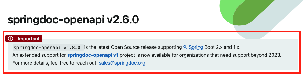 💡springdoc-openapi v1.8.0 is the latest Open Source release supporting Spring Boot 2.x and 1.x. An extended support for springdoc-openapi v1 project is now available for organizations that need support beyond 2023. For more details, feel free to reach out: sales@springdoc.org