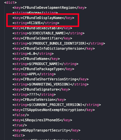 - 해당 파일 내에 CFBundleDisplayName 키의 값을 앱 이름으로 변경해 줍니다.