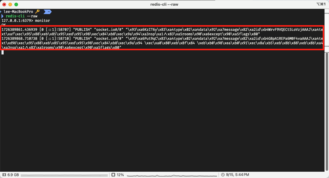 - Redis 모니터링 시 나타나는 데이터는 Socket.IO가 Redis를 통해 메시지를 발행(publish)하는 과정을 보여줍니다.