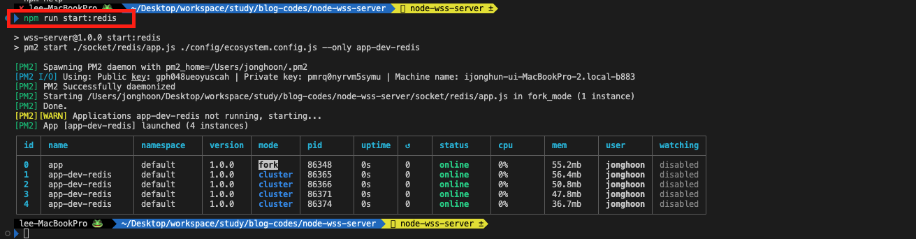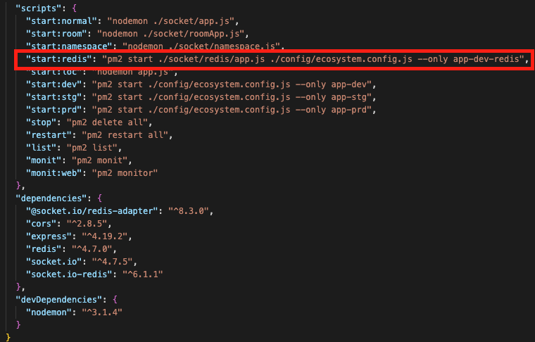 - “start:redis”라는 스크립트 명령어를 정의하였습니다. - 이는 PM2를 사용하여 애플리케이션을 실행하며 사전에 구성한 ecosystem 설정 파일을 “./config/ecosystem.config.js"참조하며, -only app-dev 옵션을 통해서 ‘app-dev’ 애플리케이션 설정말 실행하도록 지정하였습니다. - 이를 통해서 Redis와 Socket.io를 사용하는 Node.js 애플리케이션이 PM2를 통해 클러스터 모드로 실행됩니다.