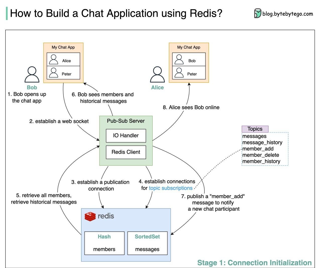 2. "messages" 주제로 메시지를 추가하고 발행합니다(add a message, publish to “messages” topic) - 서버는 받은 메시지를 "messages" 주제로 Redis에 발행합니다. 이를 통해 다른 서버 인스턴스들도 해당 메시지를 받을 수 있습니다.