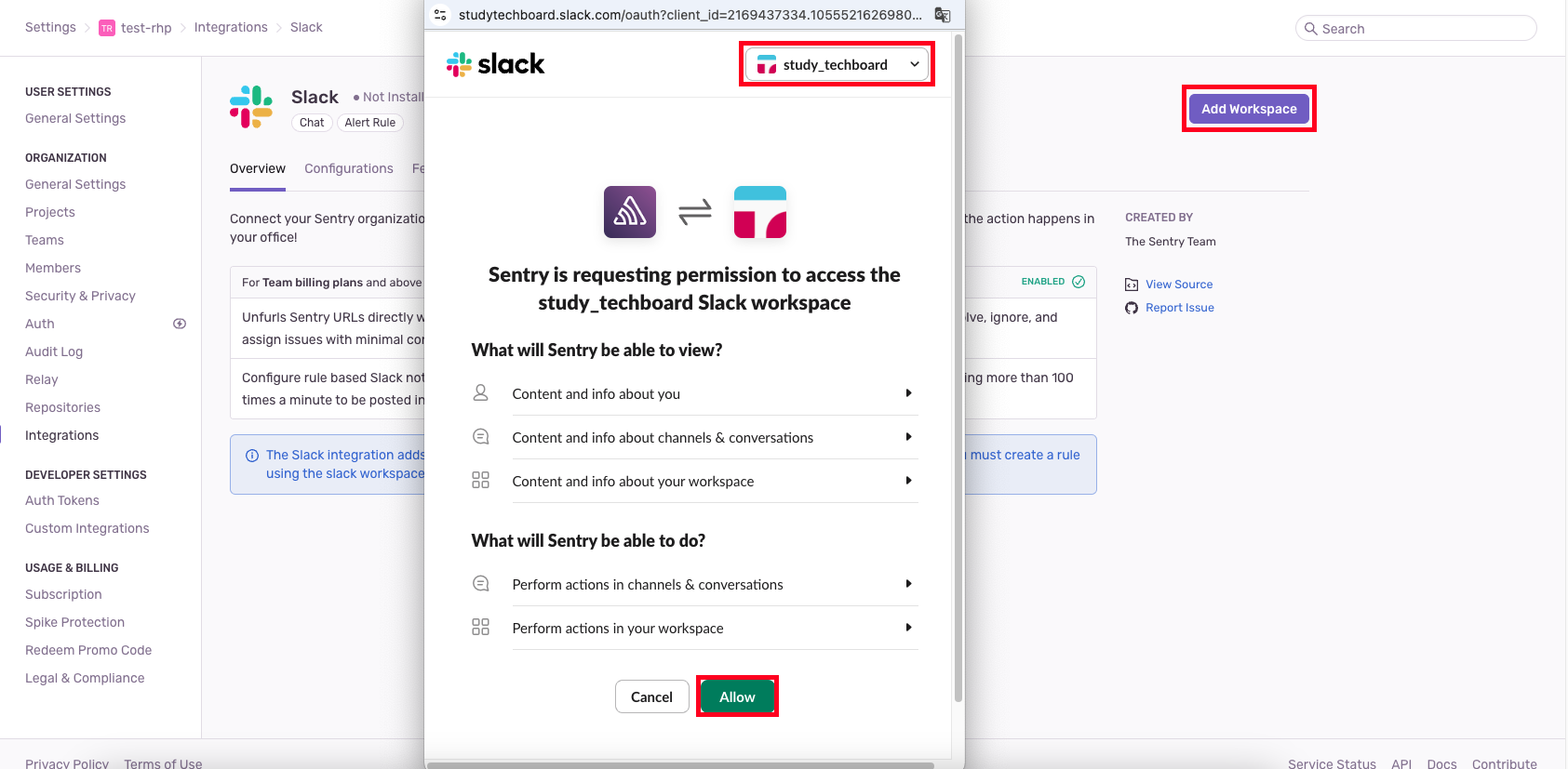 3. Add Workspace - Slack 채널 선택 - Allow를 선택합니다.