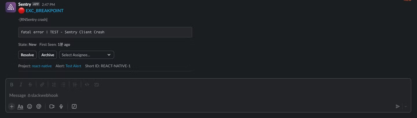 React Native 환경에서 모니터링을 위한 Sentry를 구성하며 Slack Integration을 통해 Sentry의 메시지를 전달받는 형태를 구성합니다.
