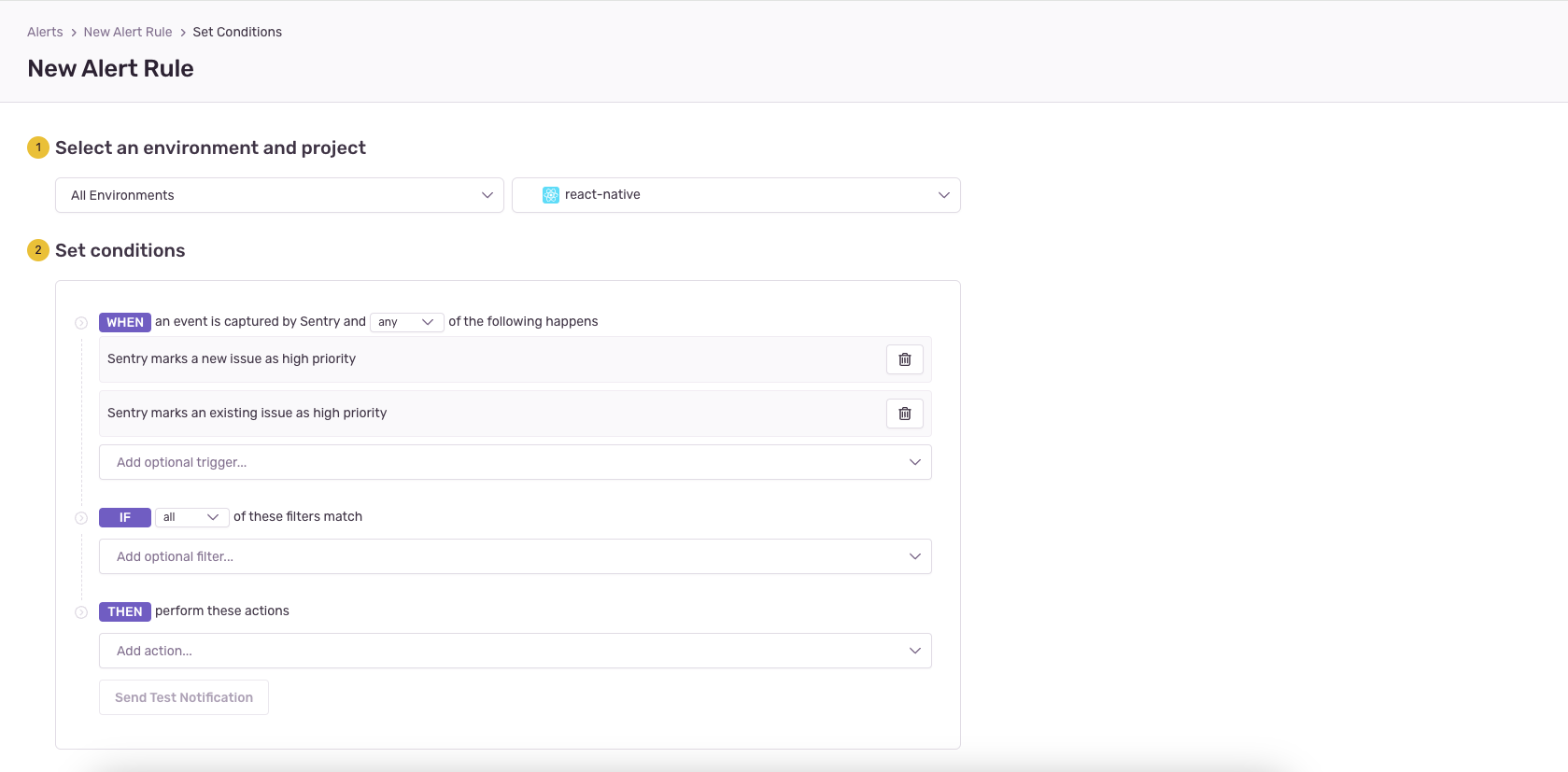 | Sessions | Crash Free Session Rate | 충돌 없는 세션의 비율이 특정 임계값 이하로 떨어질 때 알림 |