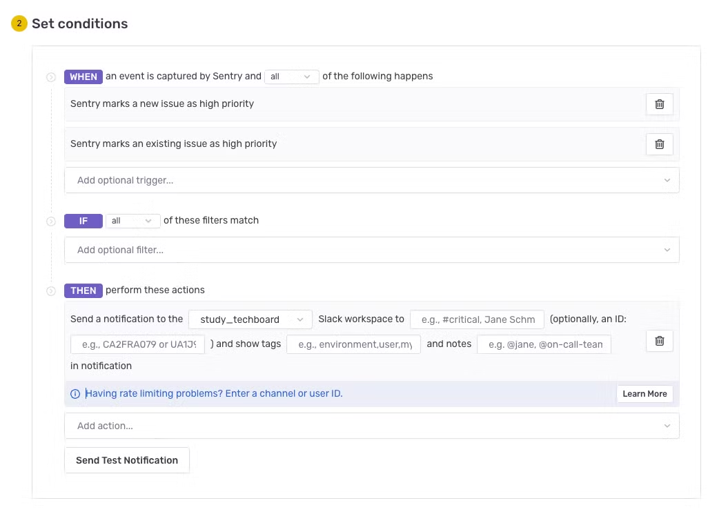 8. Set Conditions - Then 부분에서 Send a Slack notification을 선택합니다.