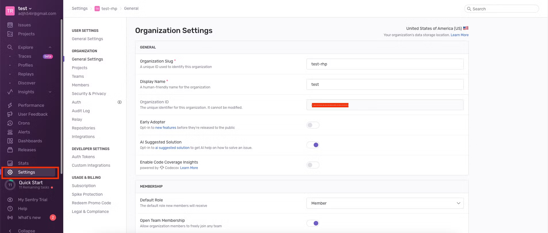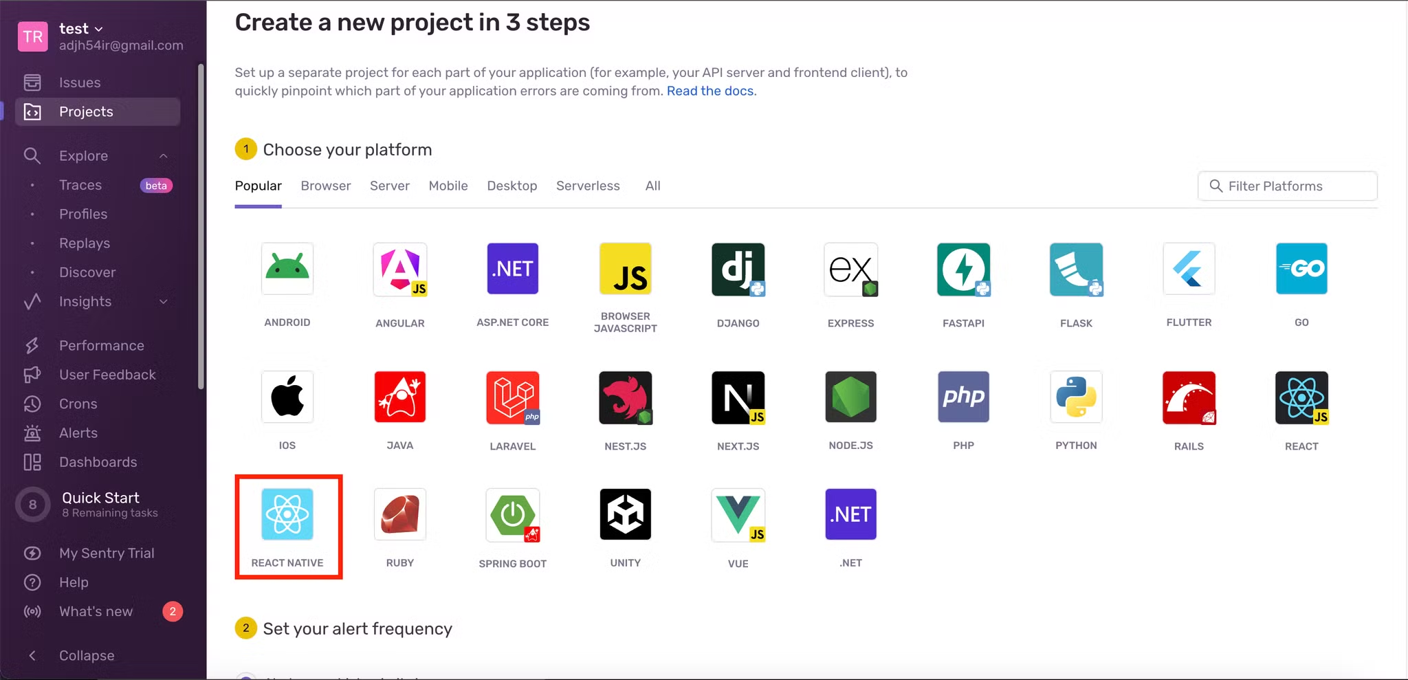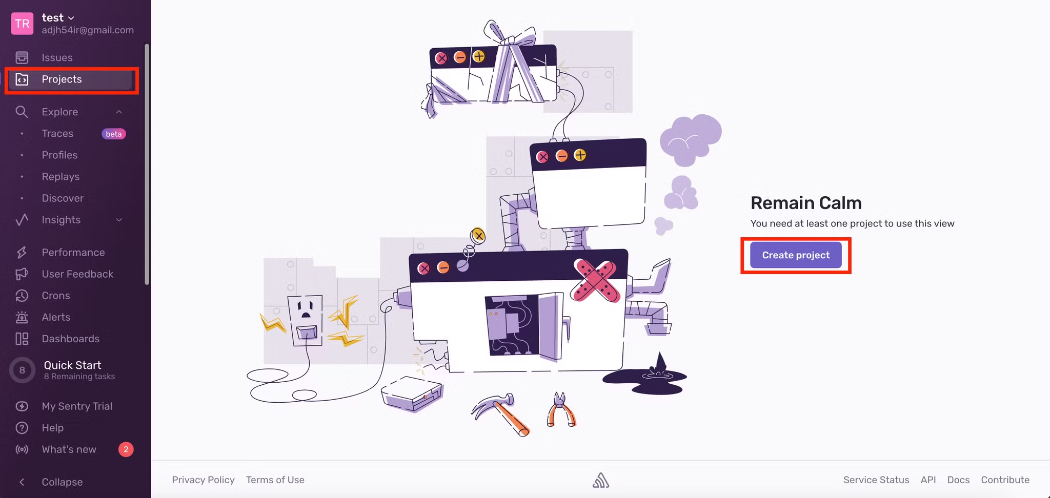 2) Sentry 환경 설정: Organization을 구성하고 Project를 생성합니다.