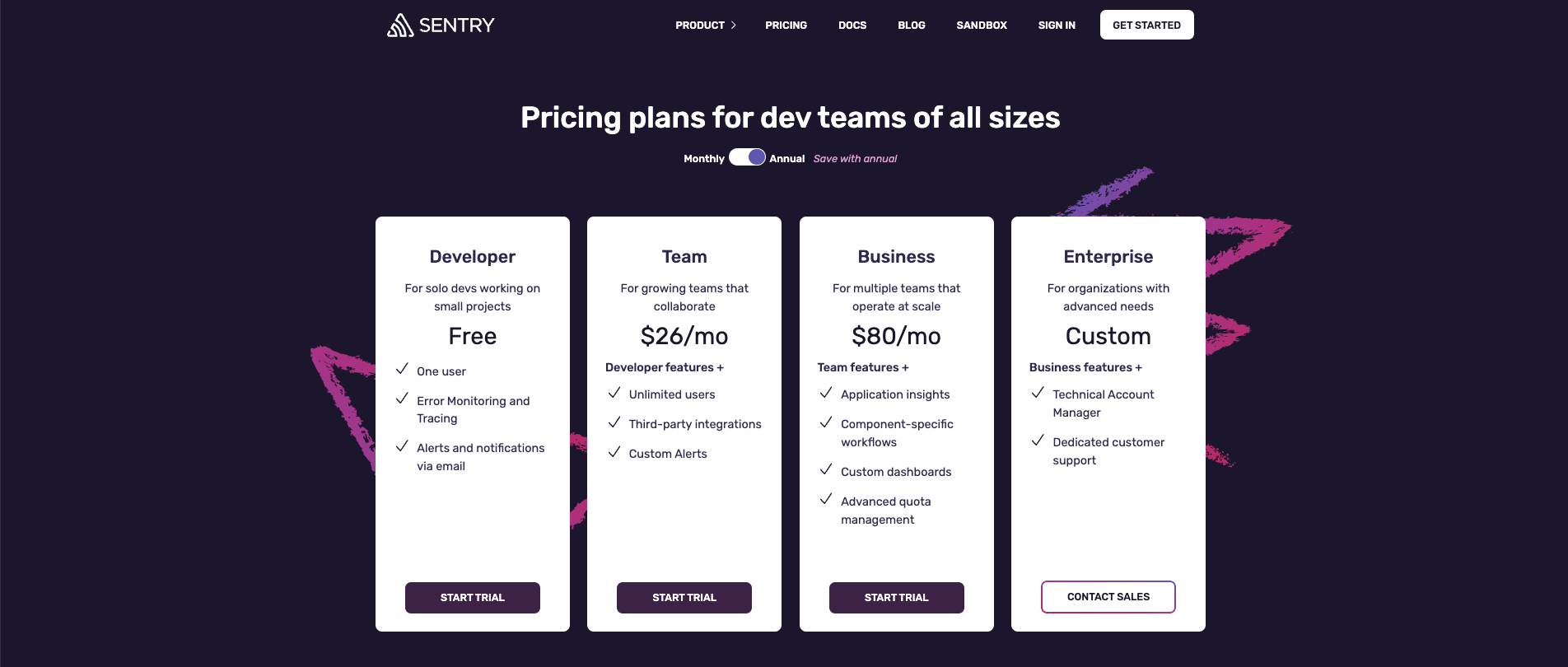 | developer | 무료 | - 1명의 사용자 - 오류 모니터링 및 추적 - 이메일을 통한 알림 및 통지 |